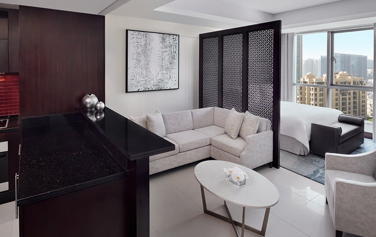 Wi-Fi, интерактивное тв, медиаустройство Apple AirPlay и сервис выбора развлечений. В числе удобств гардеробная с зеркалами Hollywood и гостиная зона с Г-образным диваном. В мраморных ванных комнатах установлены ванна, двойная раковина и тропический душ.