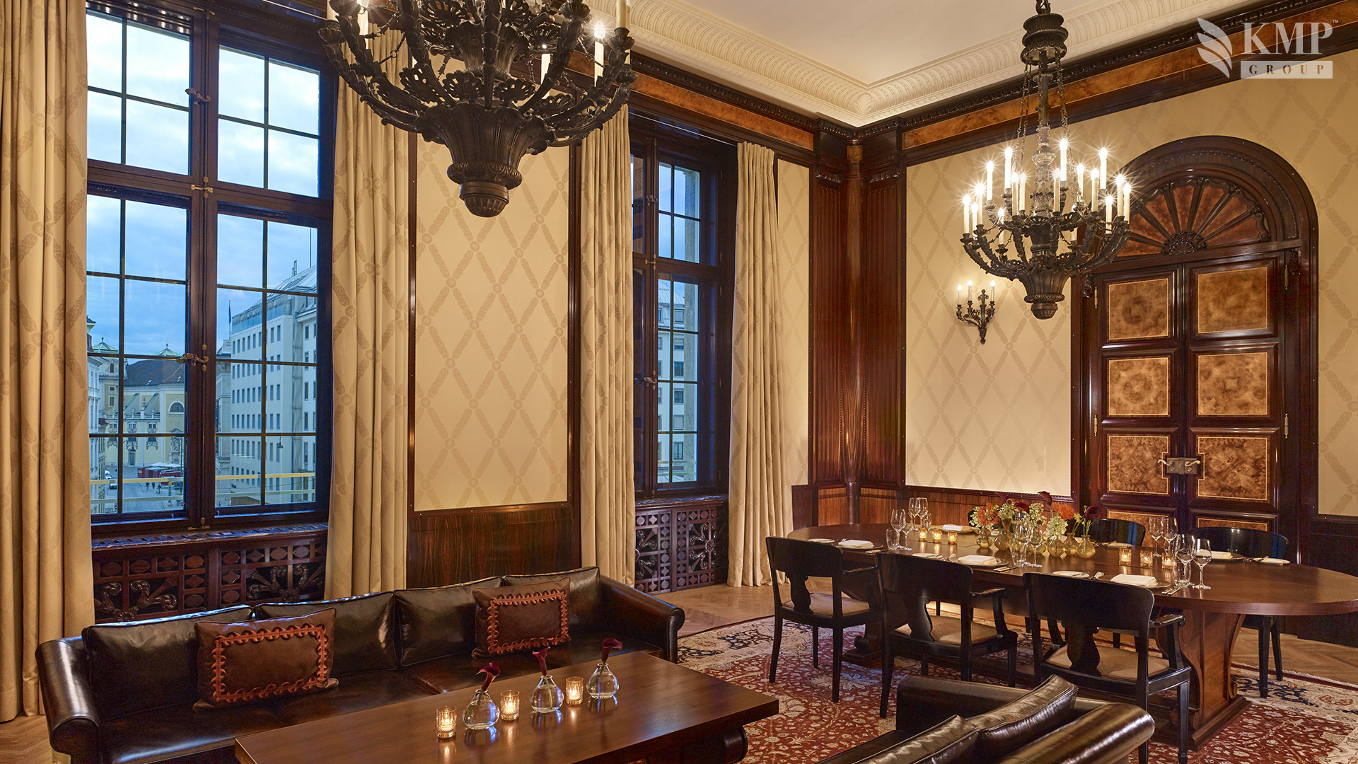 Presidential Suite (170 кв. м). Балкон, гостиная с обеденной зоной, кухня, кабинет, спальня с кроватью king-size, ванная комната с отдельно стоящей ванной и душевой, гостевой санузел, парная. Из окон видно одну из самых красивых пешеходных улиц Вены Грабен и Старый город.