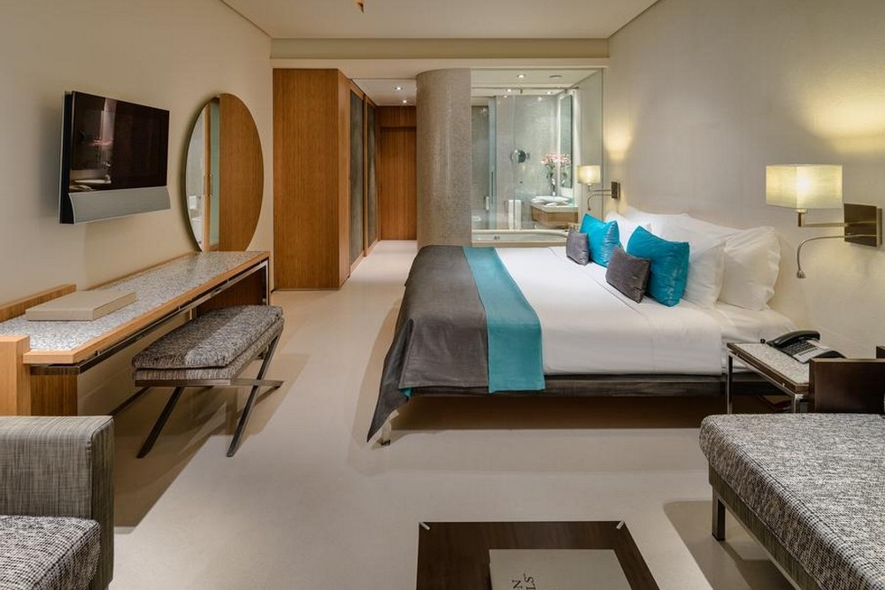 Cloud 9 corner suite (65 кв. м): терраса (20 кв. м), спальня с гостиной зоной (кровать king-size), ванная комната с ванной и душем. В некоторых номерах: ванна на открытом воздухе. Расположены на 4 этаже в угловой части здания. Панорамный вид на море и холмы.