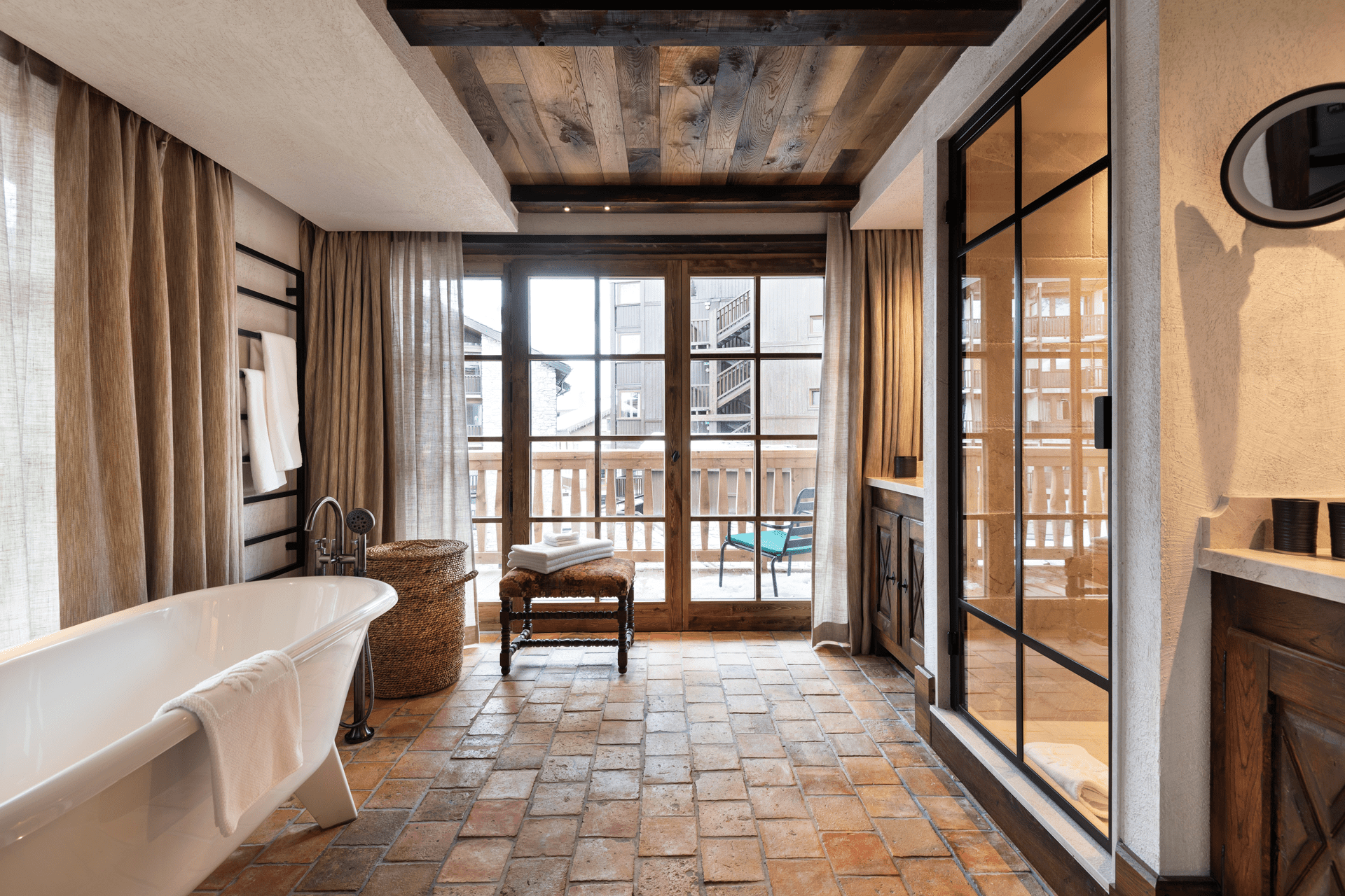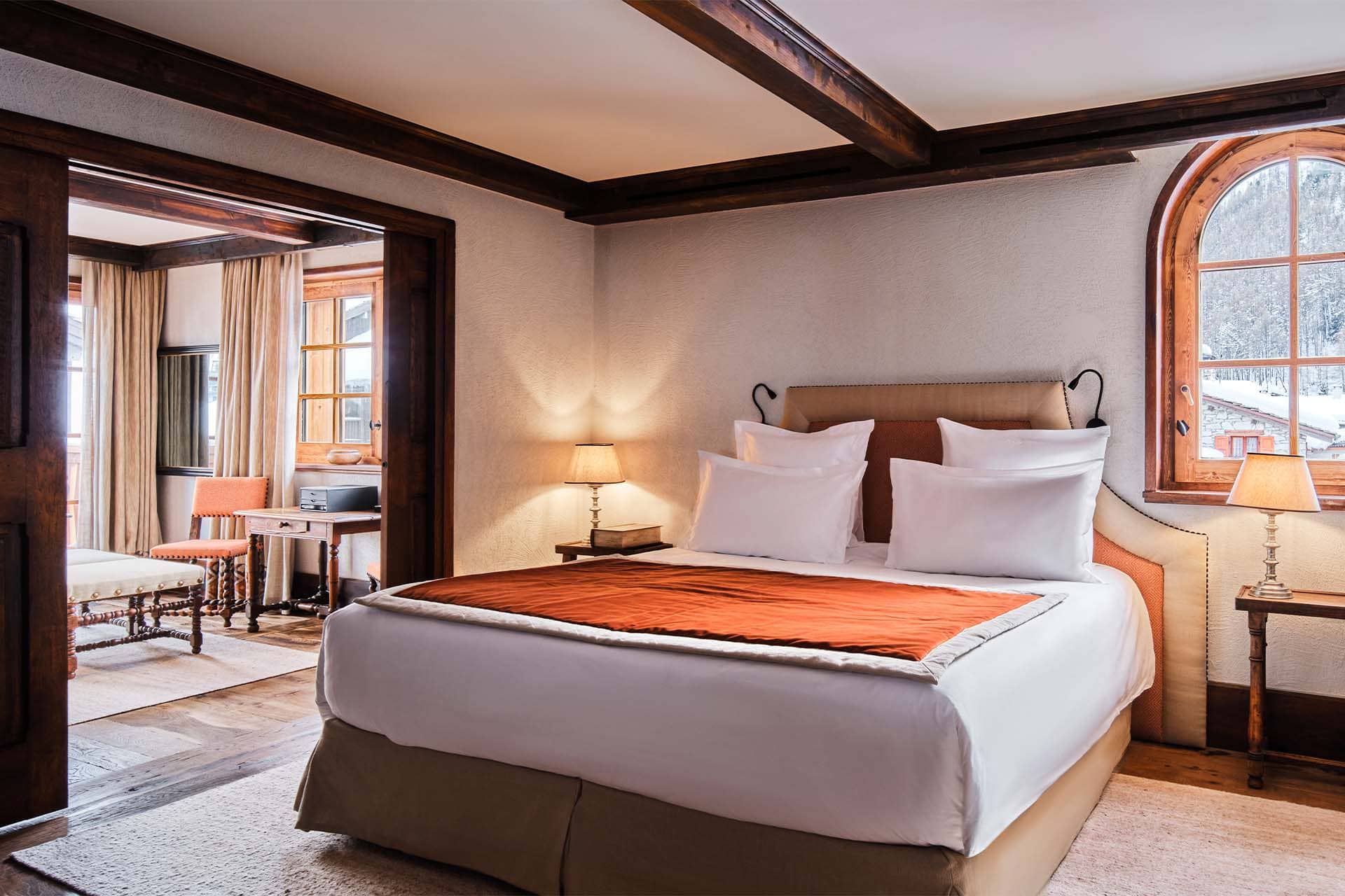 Junior suite Solaise (40 кв. м). Балкон, спальня с гостиной зоной, ванная комната с ванной и душевой кабиной с функцией парной. Вид на склоны Solaise.