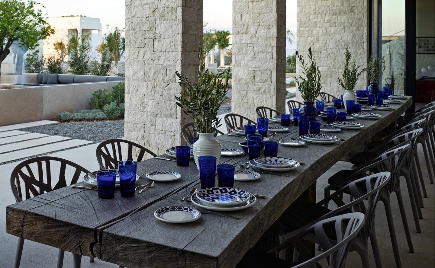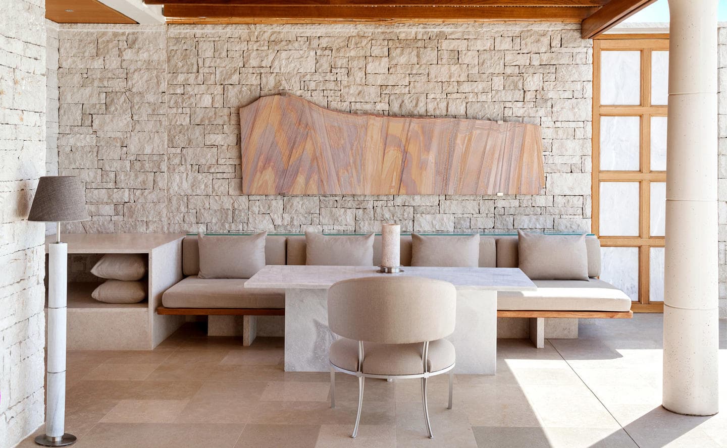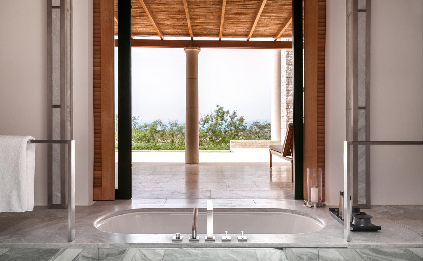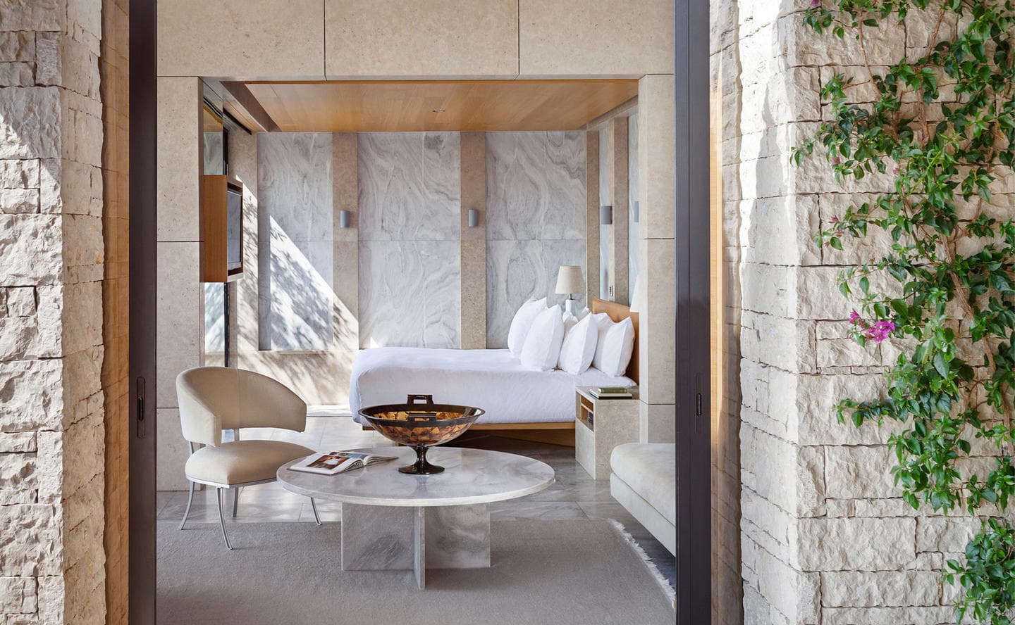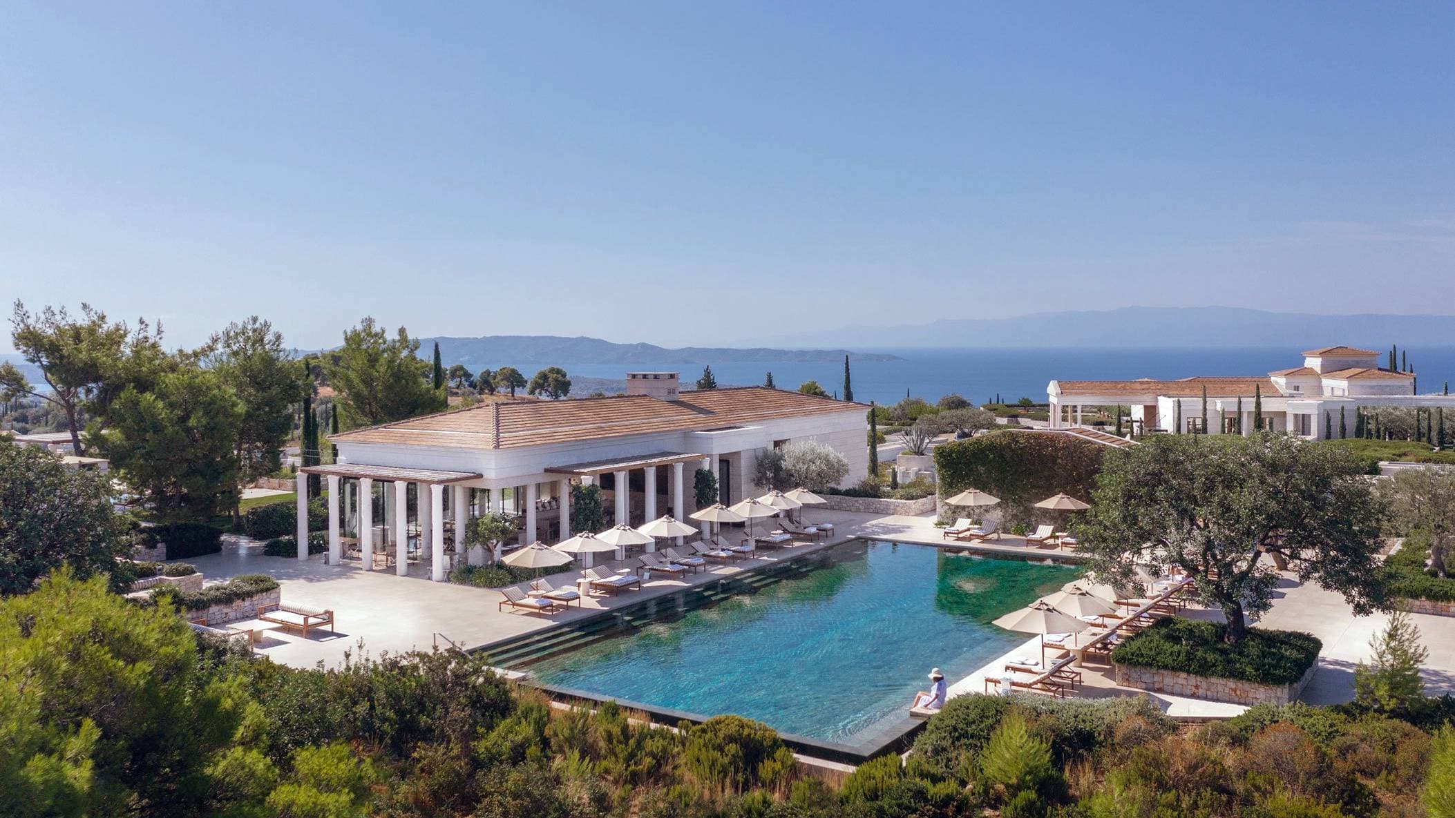 Отель Amanzoe расположен в живописном уголке полуострова Пелопоннес. 38 уединенных вилл построены на холме, откуда открываются захватывающие виды на полуостров и Эгейское море. Интерьеры выполнены в светлых тонах, в отделке использованы натуральные дерево и камень. Благодаря открытой планировке, комнаты очень просторные и светлые. Каждая вилла оборудована персональным бассейном.