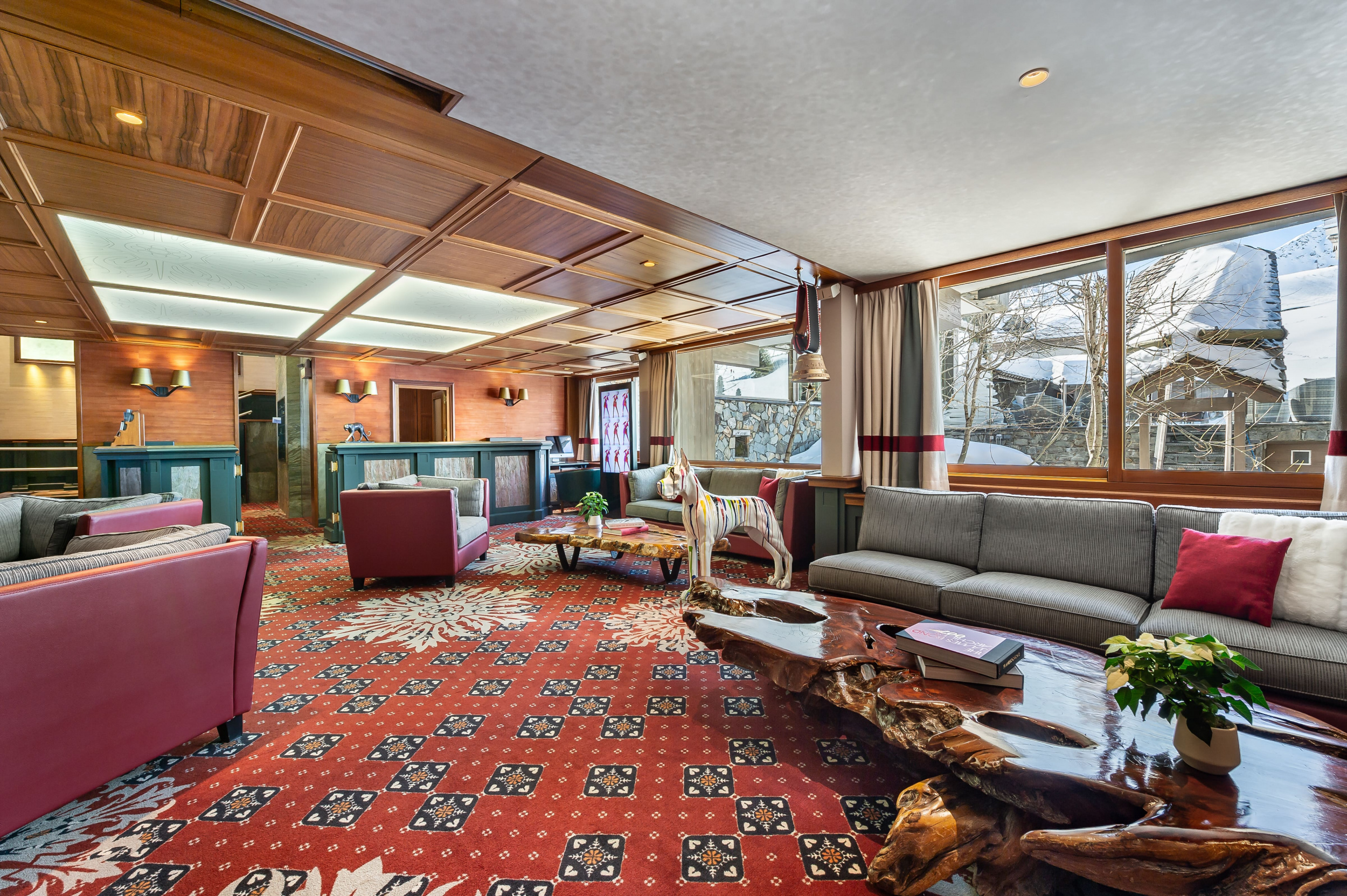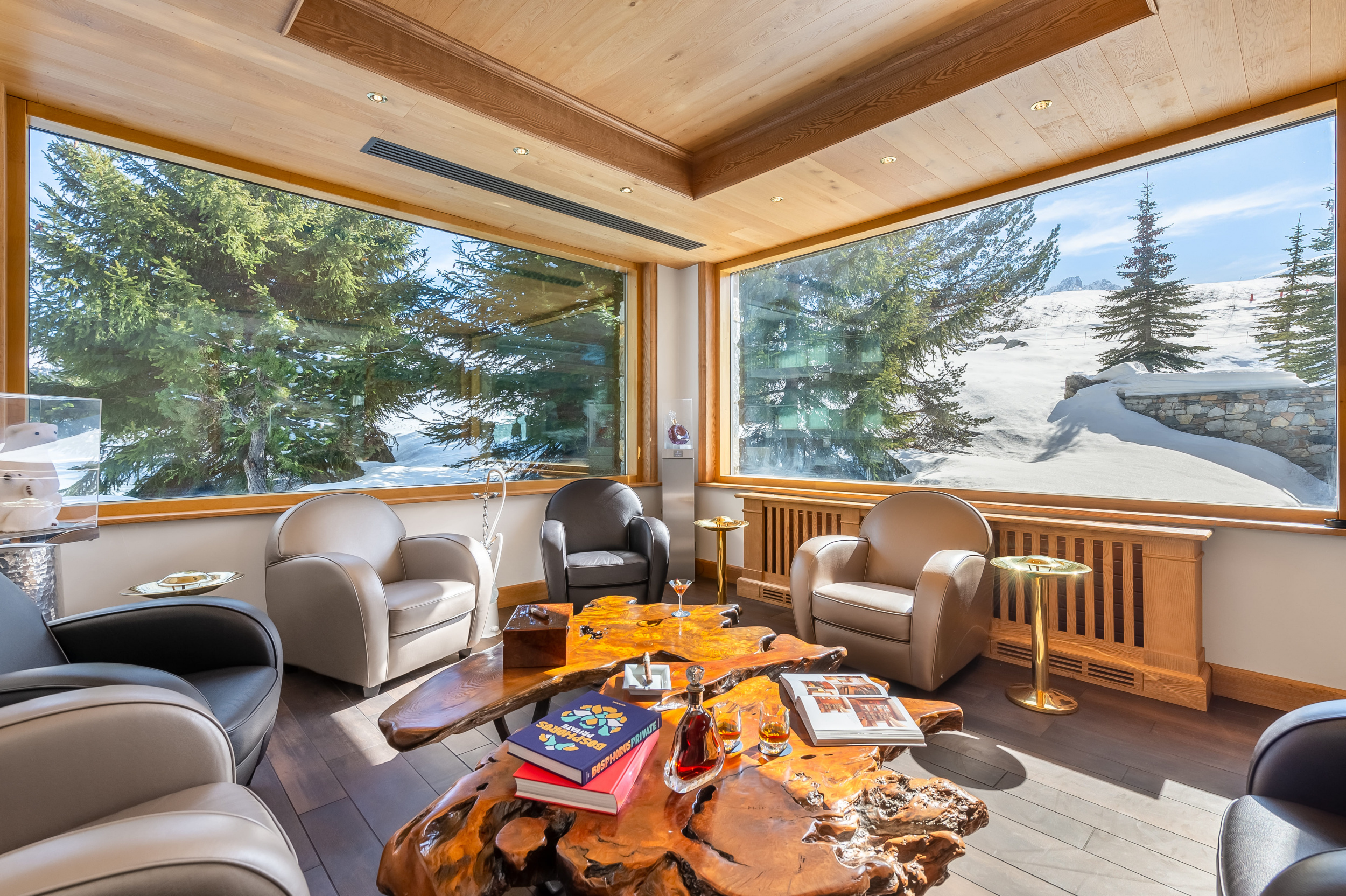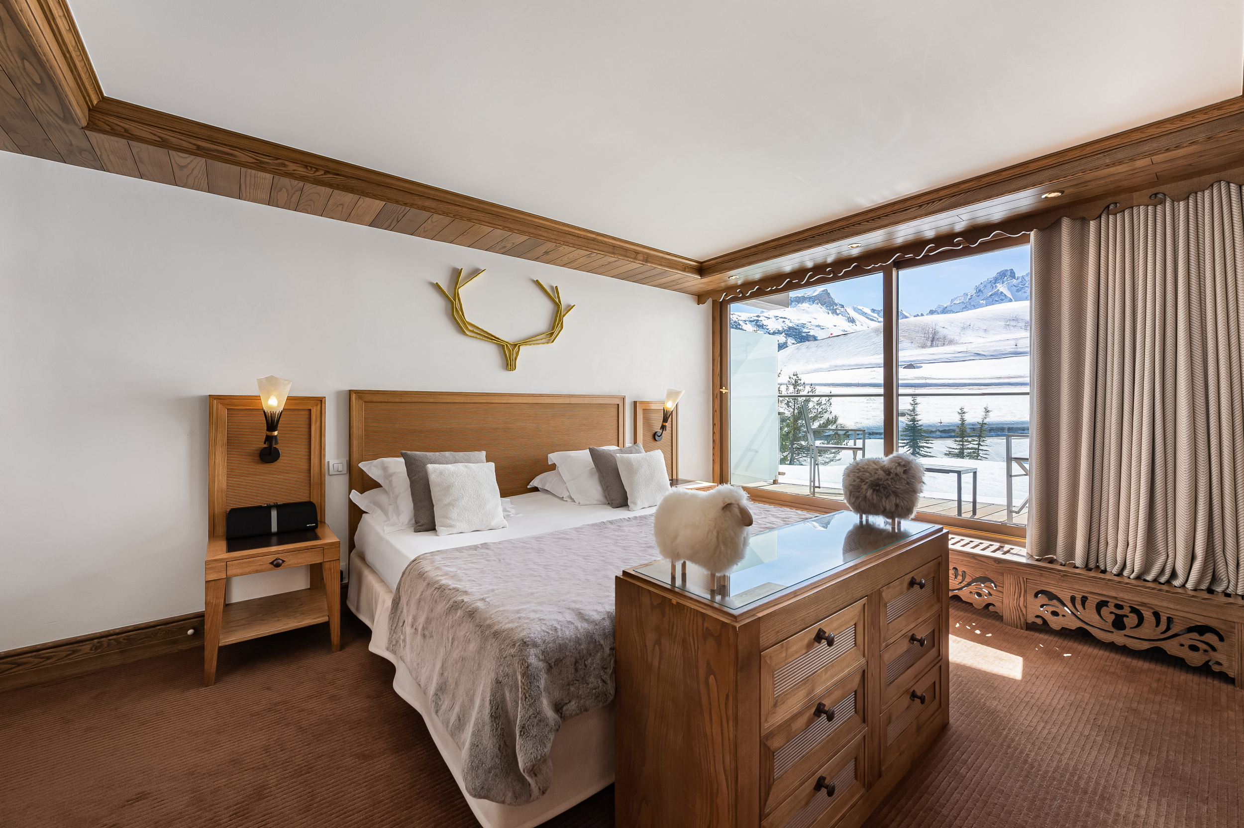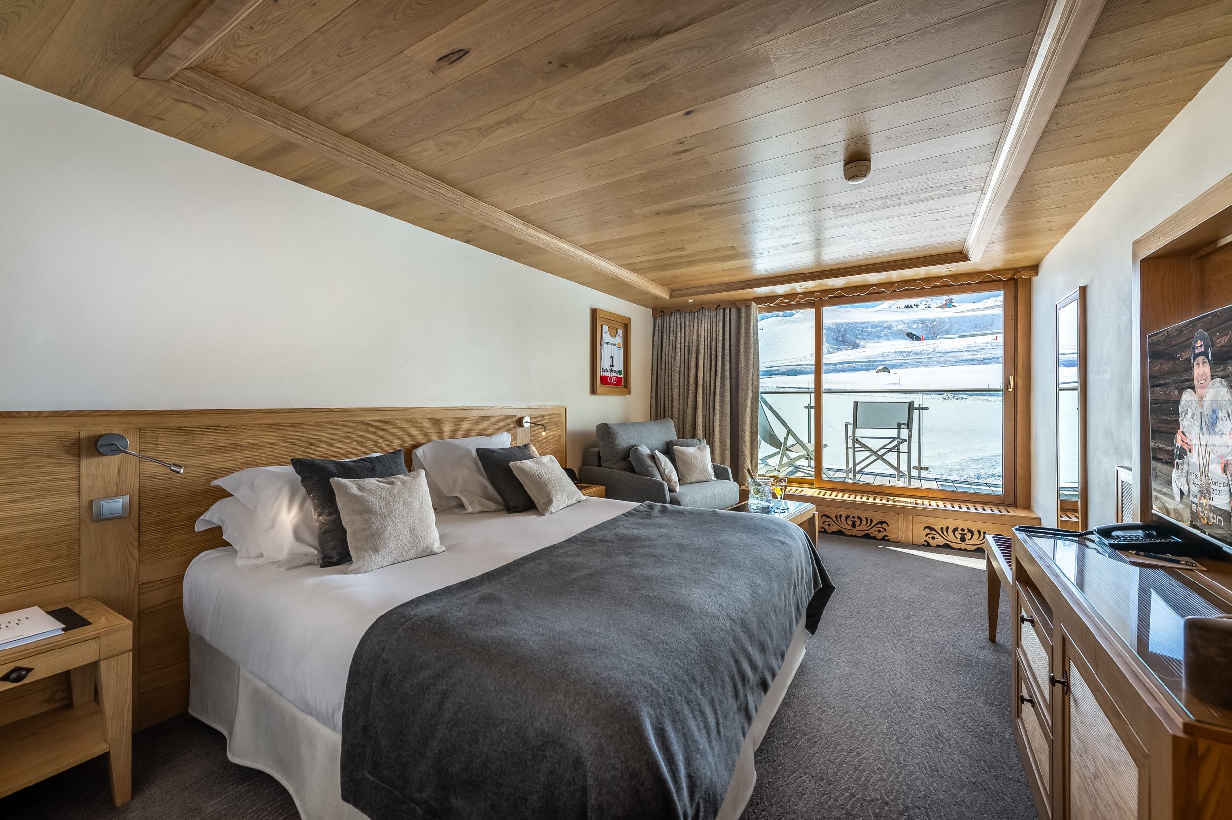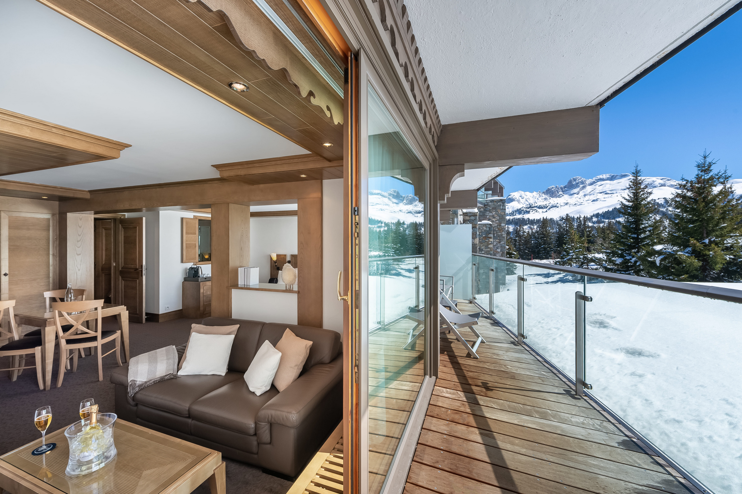 Suite Everest (2 bathrooms and 2 balconies) (149 кв. м). Двухуровневый номер. На первом уровне: балкон, прихожая, гостиная с камином и обеденной зоной. На втором уровне: гостиная, 2 спальни, 2 ванные комнаты (каждая – с ванной и душем), сауна. Вид на склоны.