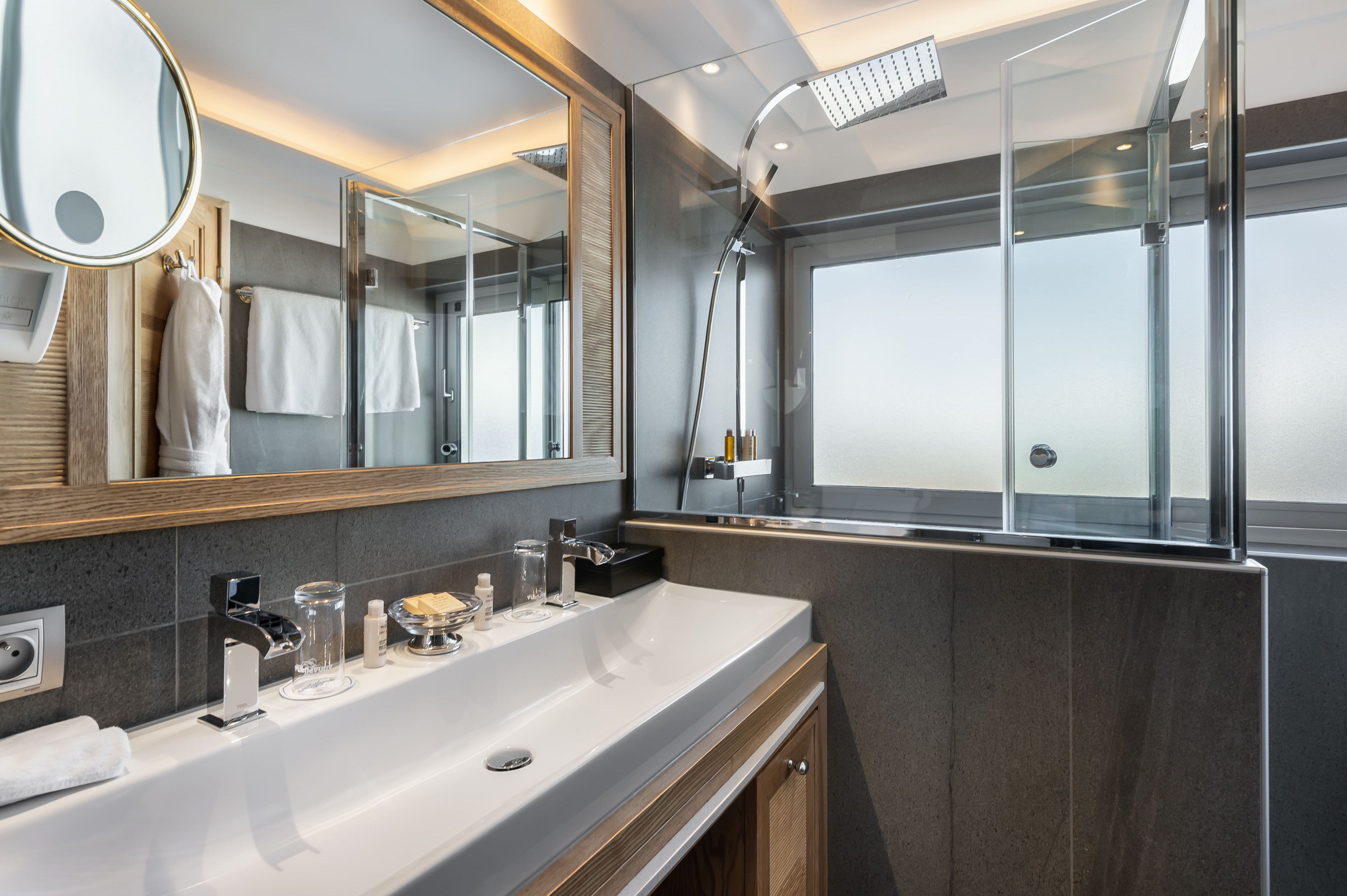 Junior suite (south-facing with balcony) (45-50 кв. м). Балкон, спальня с гостиной зоной, ванная комната с ванной и душевой кабиной. Расположены в южной части здания.
