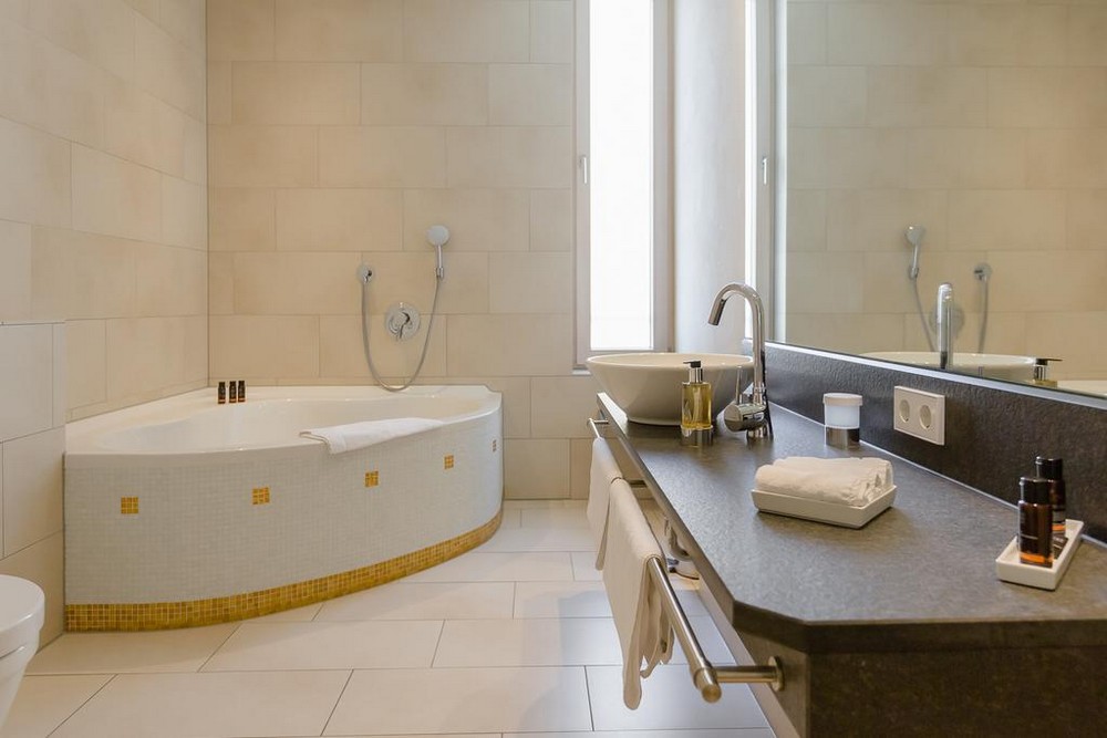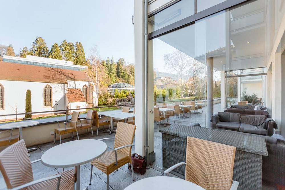 Grand suite (56-65 кв. м). Балкон или патио, гостиная с обеденной зоной (стол на 4 персоны), спальня, ванная комната с ванной и душевой кабиной Вид на SPA-центр Caracalla Therme и замок.