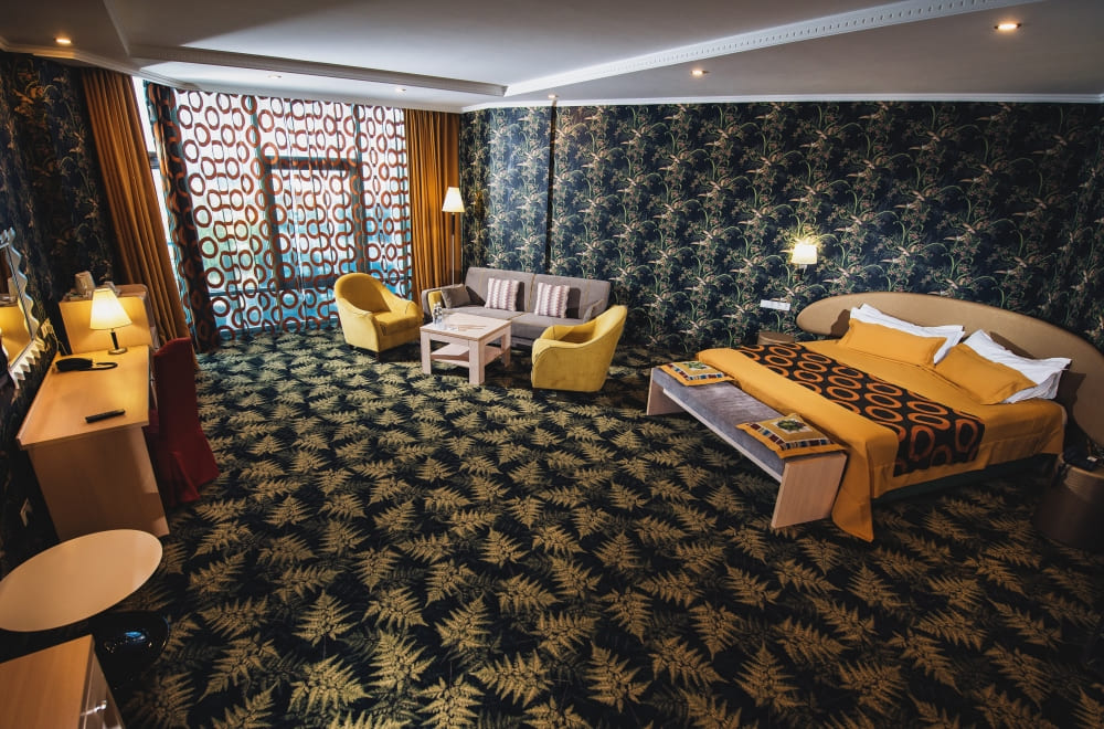 Дизайнерский полулюкс (Design deluxe room) (62 кв. м). Спальня с гостиной зоной (кровать king-size), ванная комната. Вид на море. Номера имеют различный дизайн.