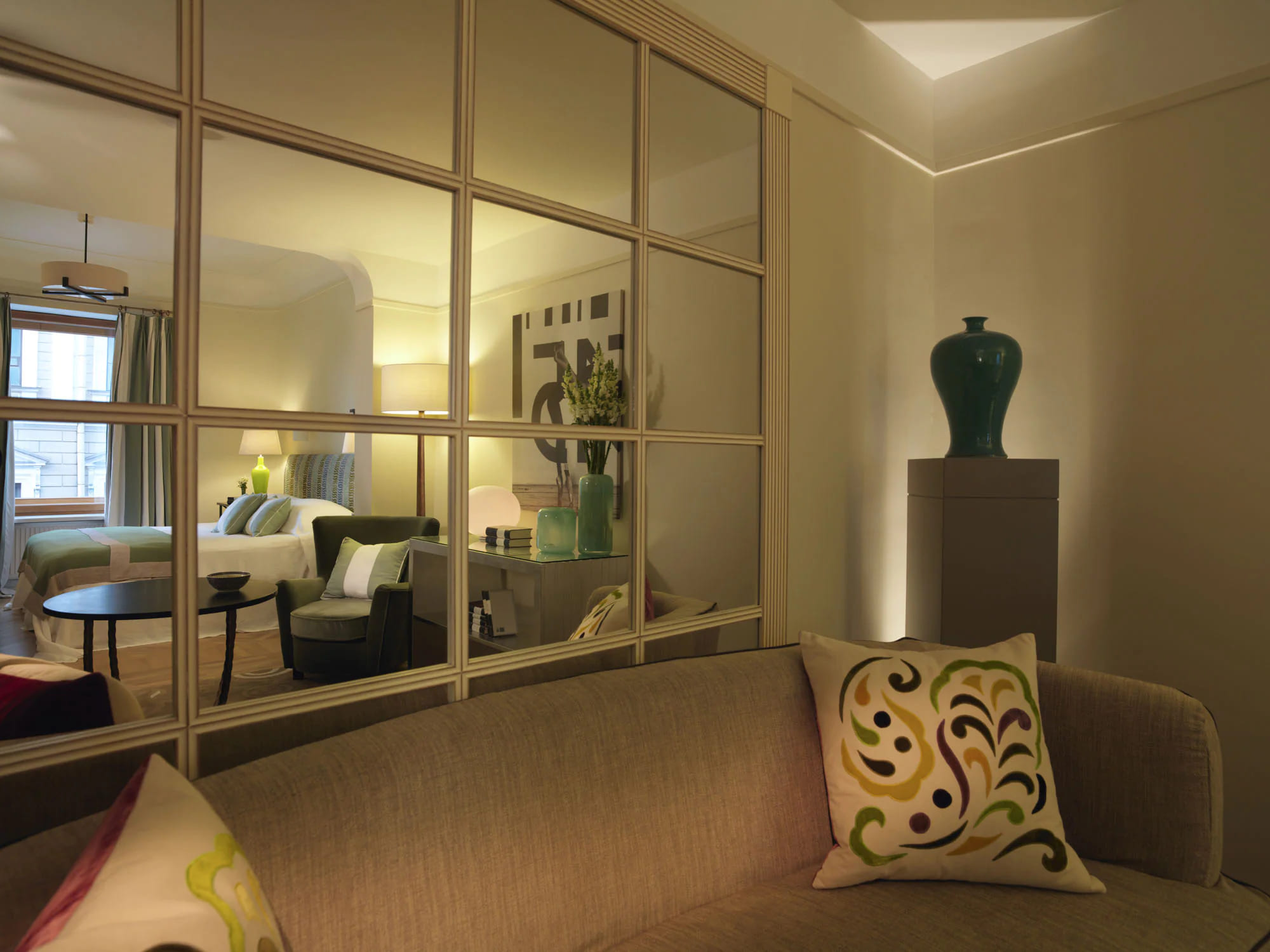 Junior suite (40-45 кв. м): спальня с гостиной зоной (кровать king-size или две отдельные кровати), ванная комната. Дополнительно: док-станция для iPod/iPhone, кофемашина Nespresso. Вид на Большую Морскую улицу. Возможно объединение с номером категории Studio room.