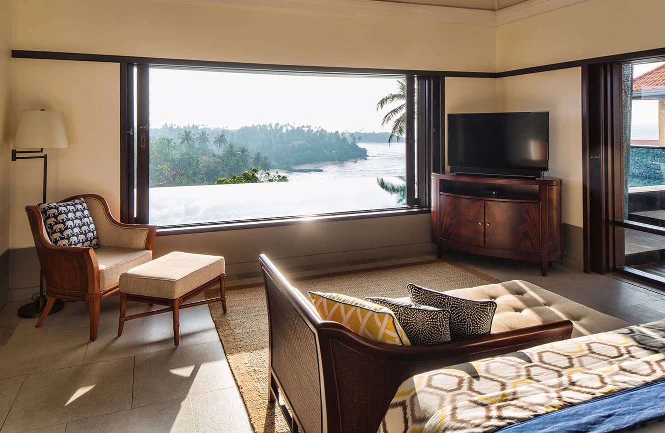 Cape Weligama residence (307 кв. м): двухэтажный номер. На первом этаже: терраса с обеденной зоной на открытом воздухе (стол на 4 персоны), спальня с кроватью king-size, гардеробная, ванная комната с ванной и душевой кабиной. На втором этаже: терраса с открытым персональным бассейном, спальня с кроватью king-size, гардеробная, ванная комната с ванной и душевой кабиной. Панорамный вид на океан.