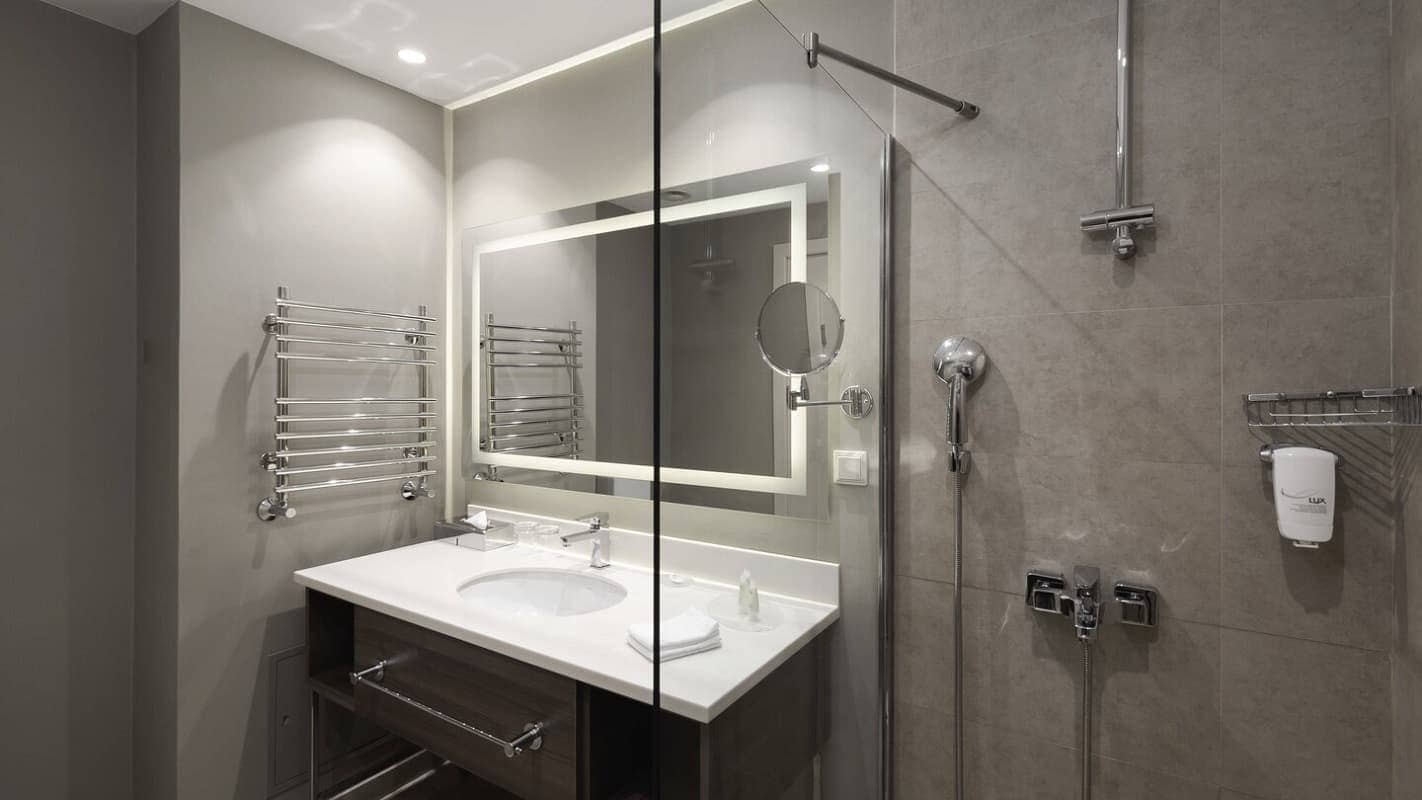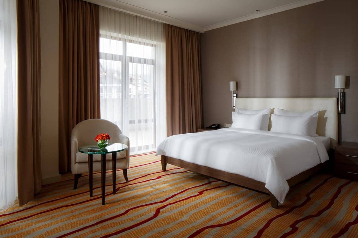 Junior suite (63 кв. м): гостиная зона, 2 спальни (одна - с кроватью king-size, вторая - с двумя отдельными кроватями), 2 ванных комнаты. Вид на город.