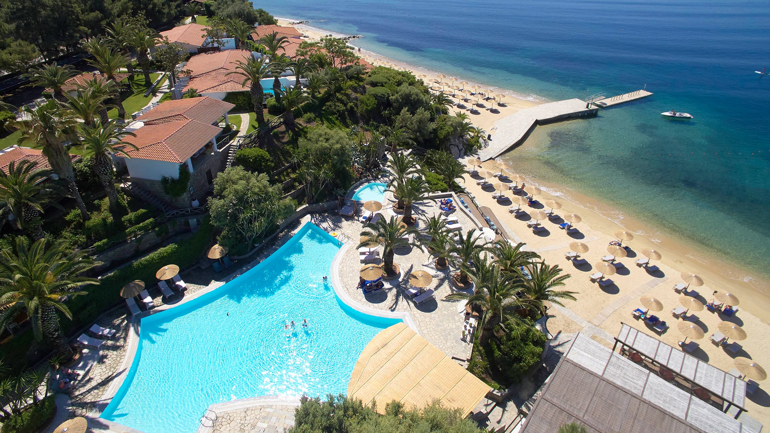 Комплекс Eagles Palace расположен в одном из самых известных и красивых мест Греции – на полуострове Афон или «Агиос Орос», что в переводе с греческого означает Святая гора. Здесь невероятные пейзажи: всегда синее небо, теплое море, белый песок и холмы, покрытые оливковыми рощами и сосновыми лесами. Среди этой красоты, на самом берегу моря, и расположен очаровательный Eagles Palace. Отель входит в престижную ассоциацию Small Luxury Hotels of the World и имеет множество наград: Eco-Label за бережное отношение к природе и пляжный «Голубой флаг» ЕС, «Золотой Морфей» Лучшего отеля Греции и «Серебряный Морфей» Лучшего SPA-отеля. Здание отеля построено в византийском стиле. Элегантные, светлые номера отличаются изящным оформлением, в отделке использованы натуральные материалы. В бунгало есть просторный балкон с обеденным столом на открытом воздухе, а некоторые номера располагают персональным бассейном, где, благодаря специально-оборудованной зоне можно отдыхать и принимать солнечные ванны. В ресторанах отеля гостям предложат отведать блюда международной, греческой и азиатской кухонь. На открытой террасе ресторана Kamares Restaurant, глядя на бесконечное море, остров Ammouliani и наслаждаясь вкусом великолепного вина, можно отведать неповторимые произведения авторской кухни в исполнении шеф-повара.