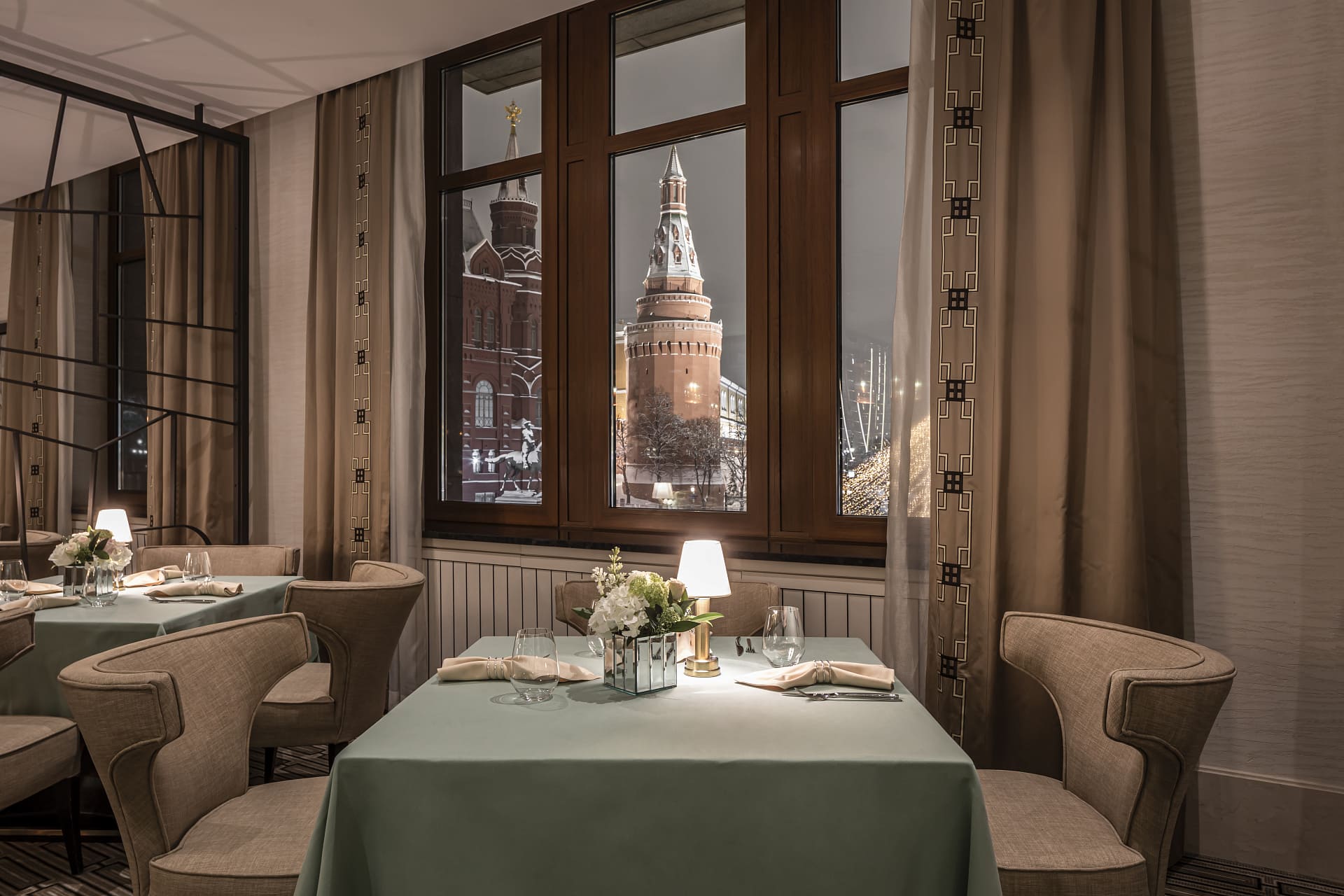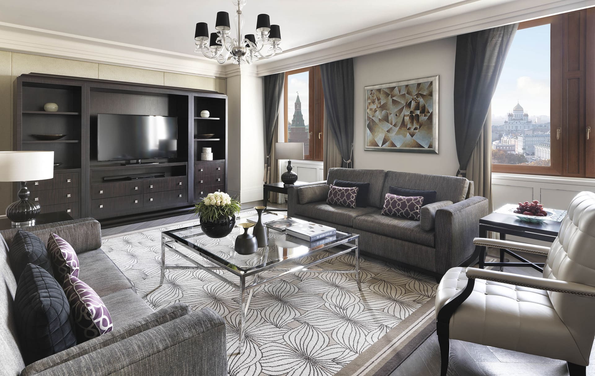 Grand premier suite (158-214 кв. м). Прихожая, гостиная с обеденной зоной (стол на 12 персон) и камином, кладовая, спальня с кроватью king-size, гардеробная, 2 ванные комнаты (одна – с сауной, ванной и душевой кабиной, вторая – с душевой кабиной). Расположены на 5 этаже, 6 этаже и с 8 по 10 этаж. Вид на Красную площадь, Кремль, Александровский сад и Манежную площадь.