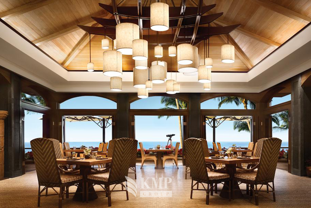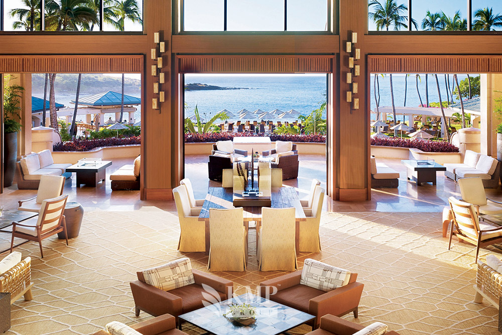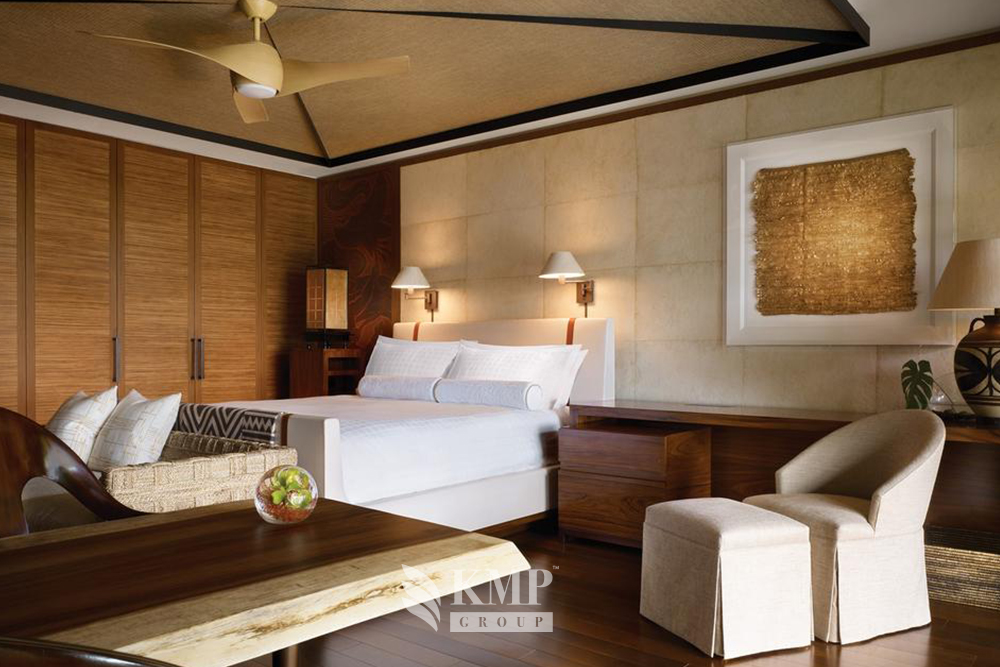 Hulopo’e suite (165 кв. м). Балкон (34 кв. м), гостиная с обеденной зоной (стол на 6 персон), кладовая, спальня с кроватью king-size, гардеробная, ванная комната с ванной и отдельной душевой кабиной, гостевой туалет. Дополнительно: факс, телевизор в ванной комнате. Расположен на 2 этаже. Панорамный вид на океан. Возможно присоединение трех дополнительных спален.