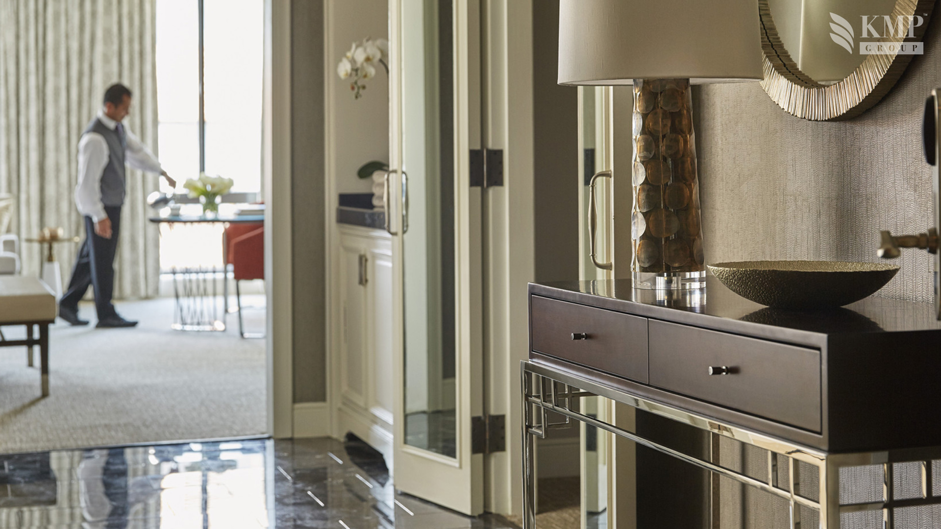 Royal suite (371 кв. м). Терраса (93 кв. м) с обеденной зоной на открытом воздухе (стол на 8 персон), прихожая, гостиная, столовая (обеденный стол на 8 персон), кладовая, кабинет, спальня с кроватью king-size, 2 гардеробные, массажный кабинет, ванная комната с ванной и душевой кабиной, гостевой туалет. Расположен на 2 этаже западного крыла. Вид на Джорджтаун. Услуги персонального камердинера. Возможно присоединение двух дополнительных спален.