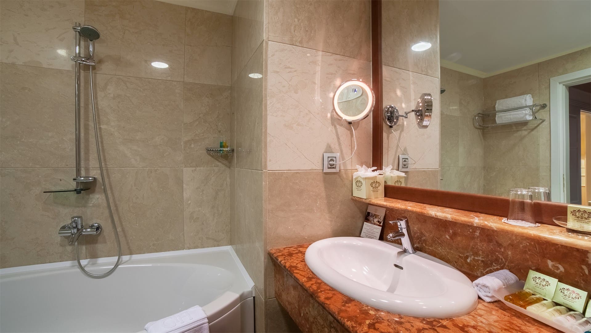 Улучшенный двухместный номер с 1 кроватью, вид на море и бассейн:Номер с площадью 31 кв.м. с потрясающим видом на Черное море. Свежий воздух зеленой природы и Черного моря позволит вам удобно спать на 2 односпальных или двуспальных кроватях размера «king-size». ЖК-телевизор с экраном диагональю 40 дюйма, просторная ванная комната, удобный рабочий стол, изящный мраморный обеденный стол, бесплатный высокоскоростной Wi-Fi, кофе-машина, мини-бар, контролируемое кондиционирование воздуха, сейф и напольные весы, все удобства в номере соответствуют потребностям и желаниям вашего гармоничного отдыха.