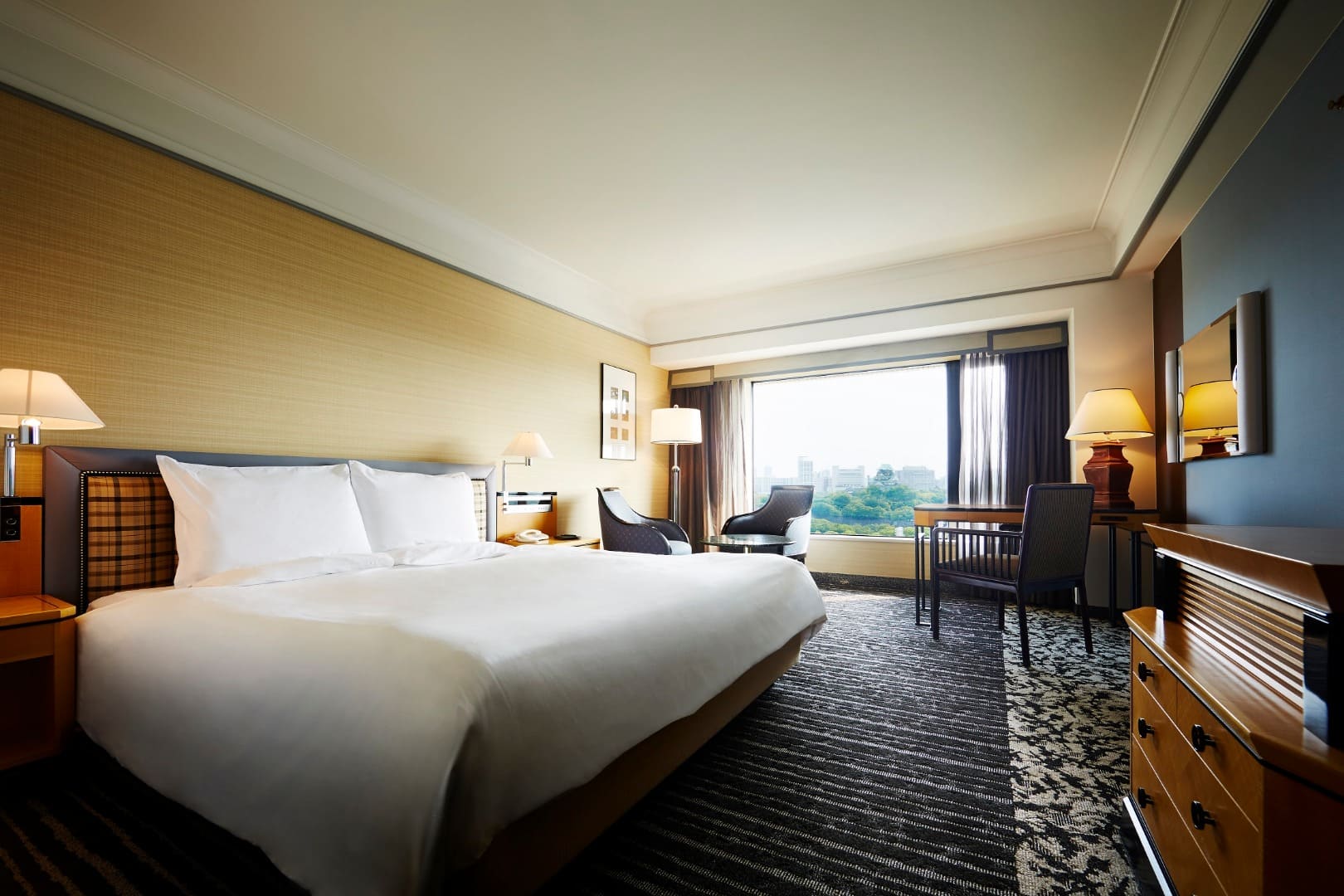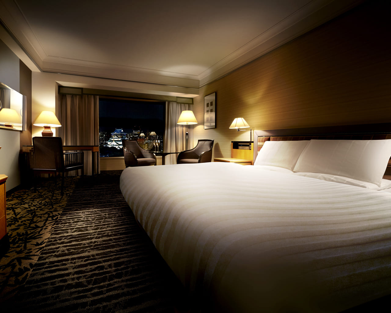 Junior Suite (60 кв. м). Гостиная, спальня с большой двуспальной кроватью, ванная комната со всеми удобствами, гардеробная. Из окон открывается вид на замок Осаки.