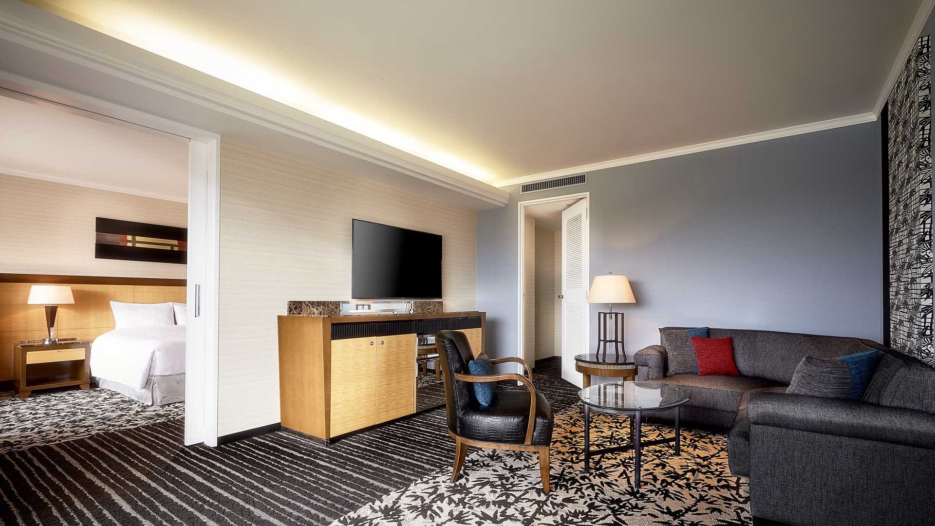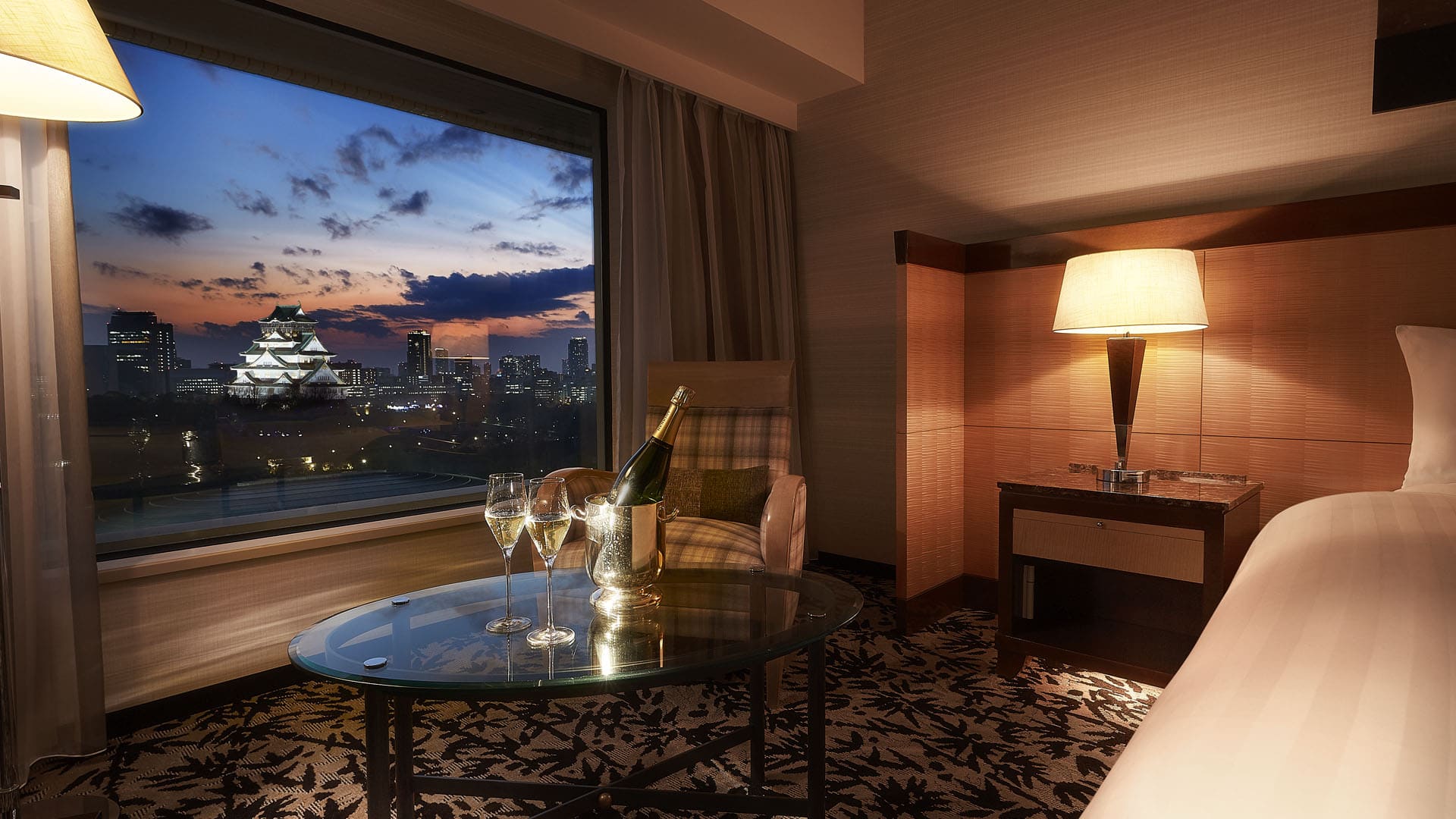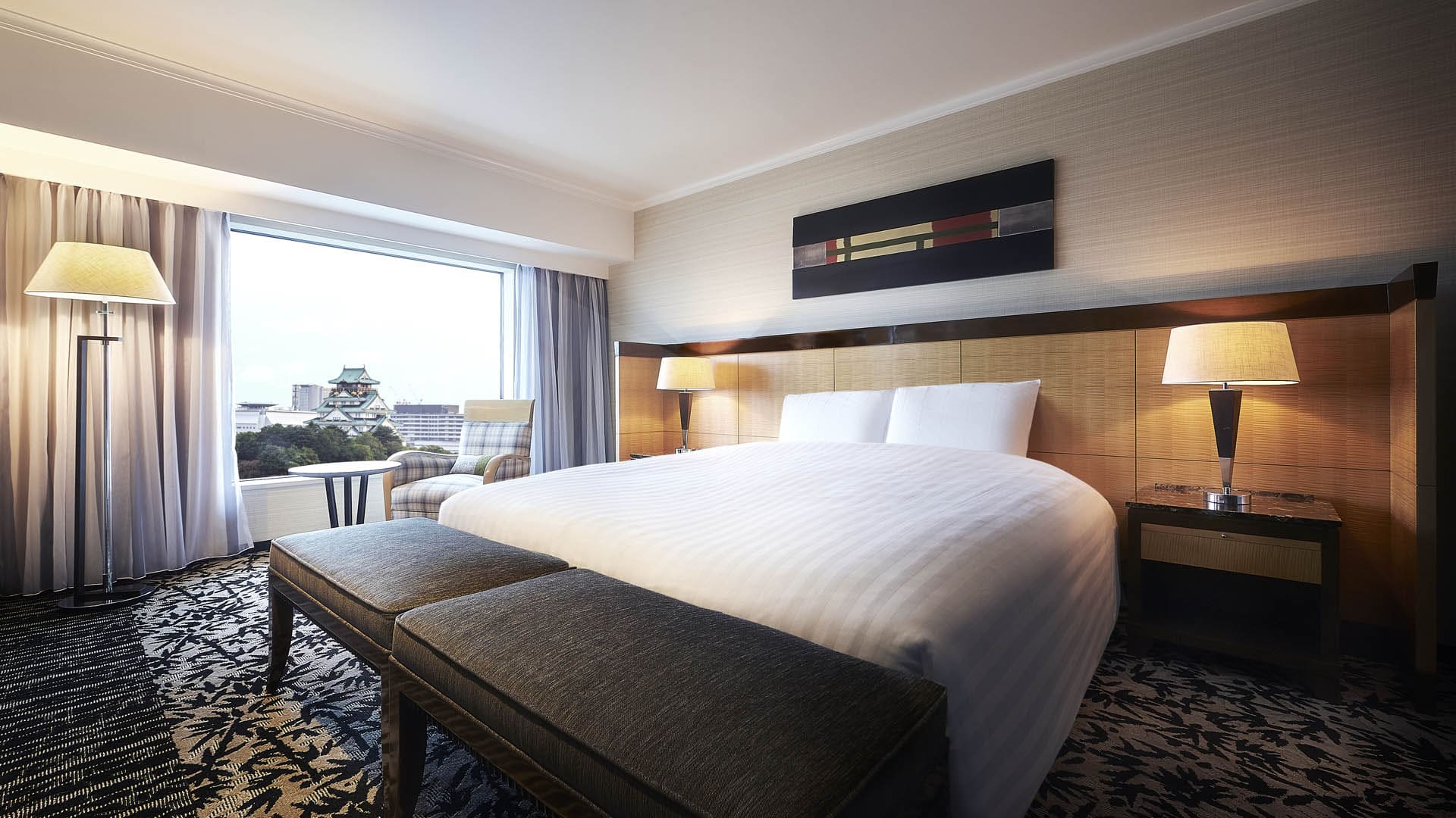Luxury Junior Suite (60 кв. м). Гостиная, спальня с большой двуспальной кроватью или двумя отдельными кроватями, ванная комната со всеми удобствами и окном, гардеробная. Вид на замок Осаки.