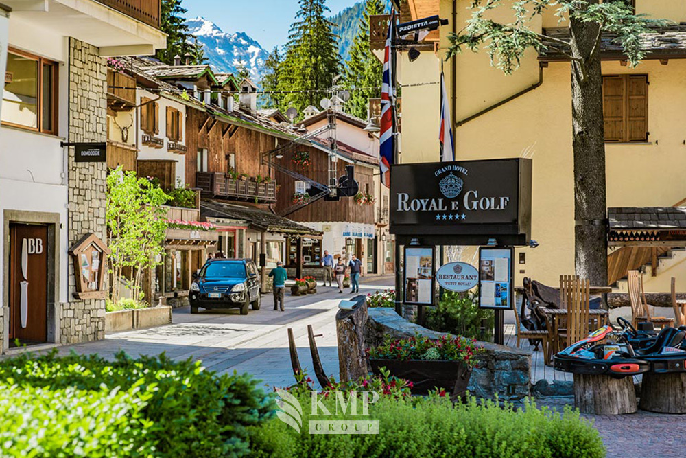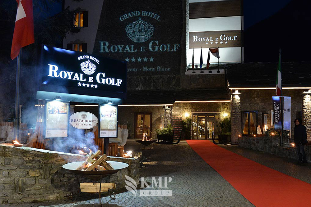 Гранд-отель Royal E Golf расположен в городе Курмайёр, у подножия горы Монблан. Лыжный автобус, на котором можно доехать до канатной дороги Курмайёр (в 300 метрах), курсирует ежедневно. Подъем до лыжных склонов Курмайёр занимает 15 минут.
