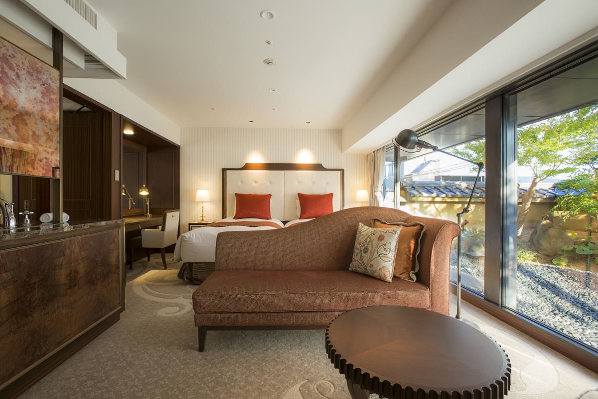 Garden Junior Suite (48 кв. м). Открытое пространство с гостиной зоной, спальней с двумя кроватями и ванной комнатой. Из окон открывается вид на красивый японский сад.