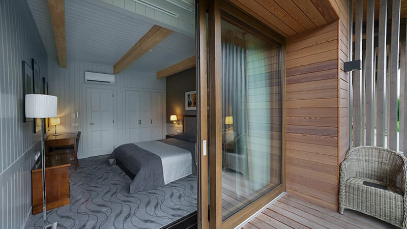 Сюит (105 м.кв.): Две спальни (двуспальная кровать – водяной матрас, телевизор), две гостиные (телевизор, мини-кухня: холодильник, микроволновая печь, электрический чайник), две ванных комнаты (душевая кабина и ванна), WI-FI, телефон, ТВ (НТВ+), сейф, кондиционер, терраса, стоянка для 2 а/м.
