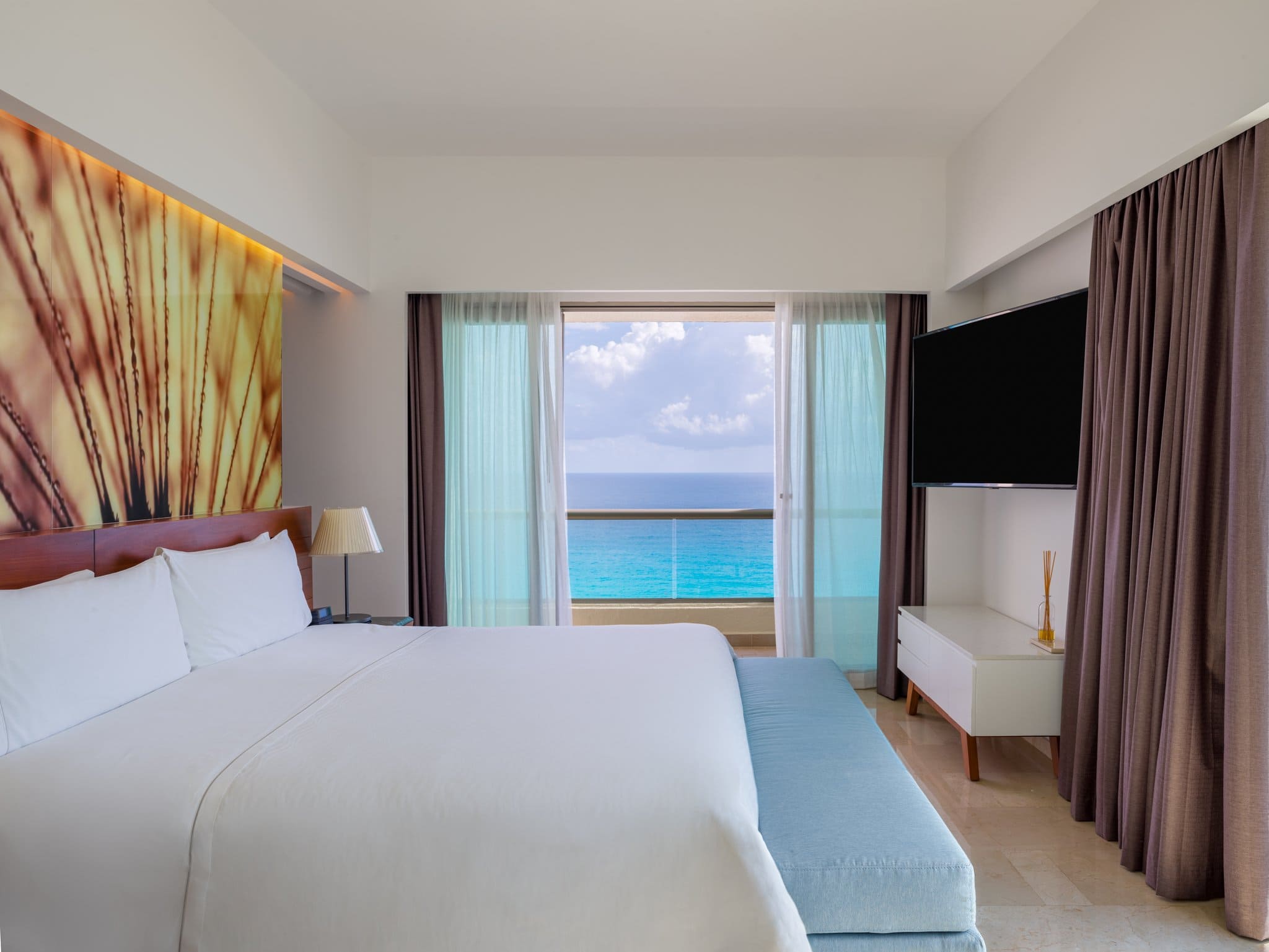 Aqua сlub ocean front room with balcony: балкон, спальня с кроватью king-size или двумя двуспальными кроватями, ванная комната с ванной и душевой кабиной. Фронтальный вид на море. Гости данных номеров имеют особые привилегии.