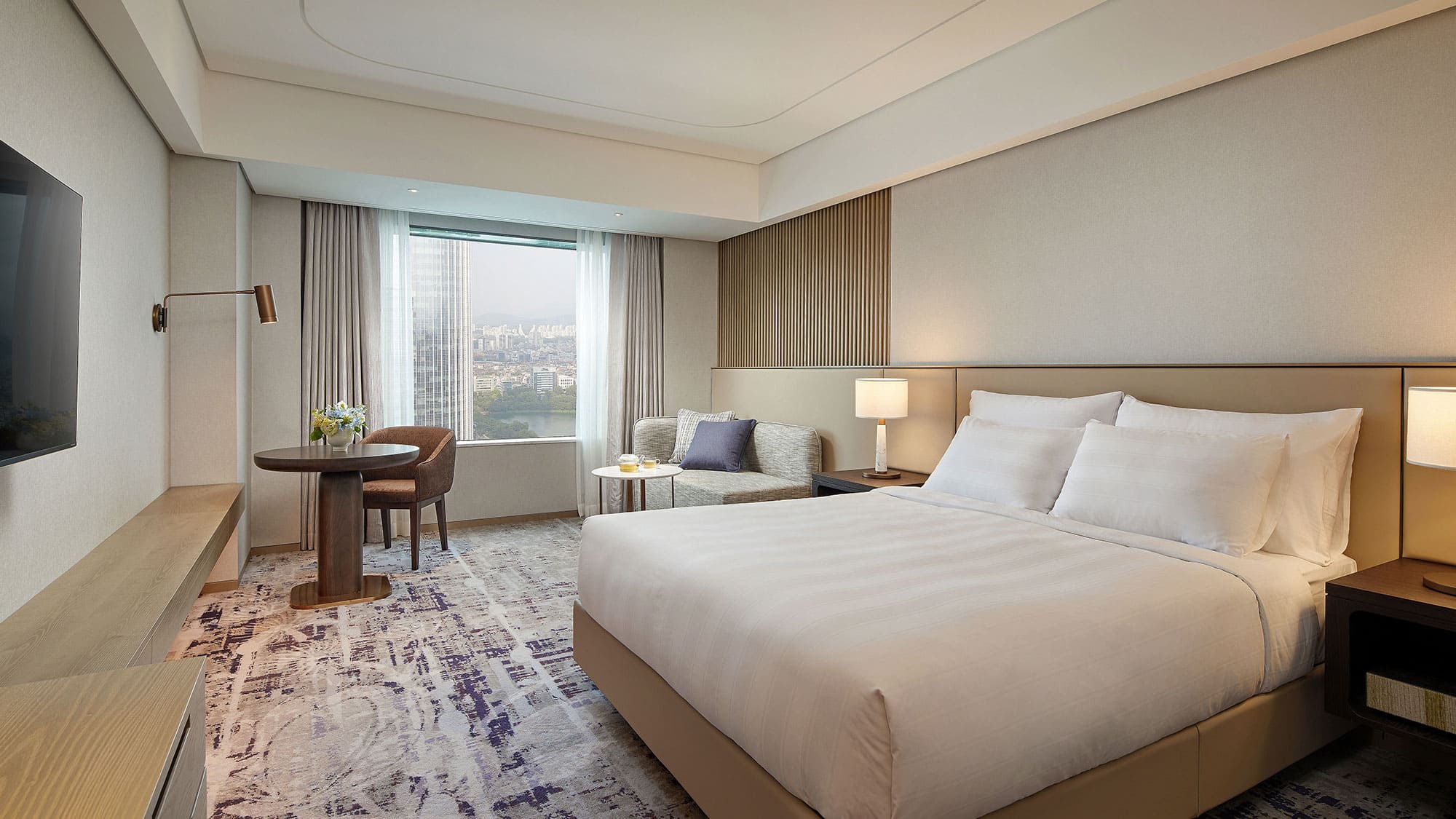 Deluxe room (29 кв. м). Спальня с двуспальной кроватью, ванная комната. Вид на город.