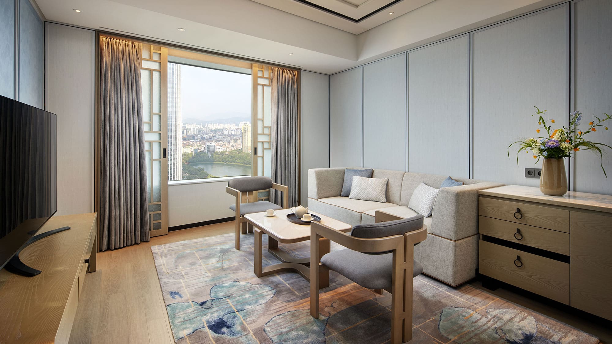 Corner suite (41 кв. м). Гостиная, спальня с двуспальной или двумя отдельными кроватями, ванная комната. Расположены в угловой части здания. Вид на город.