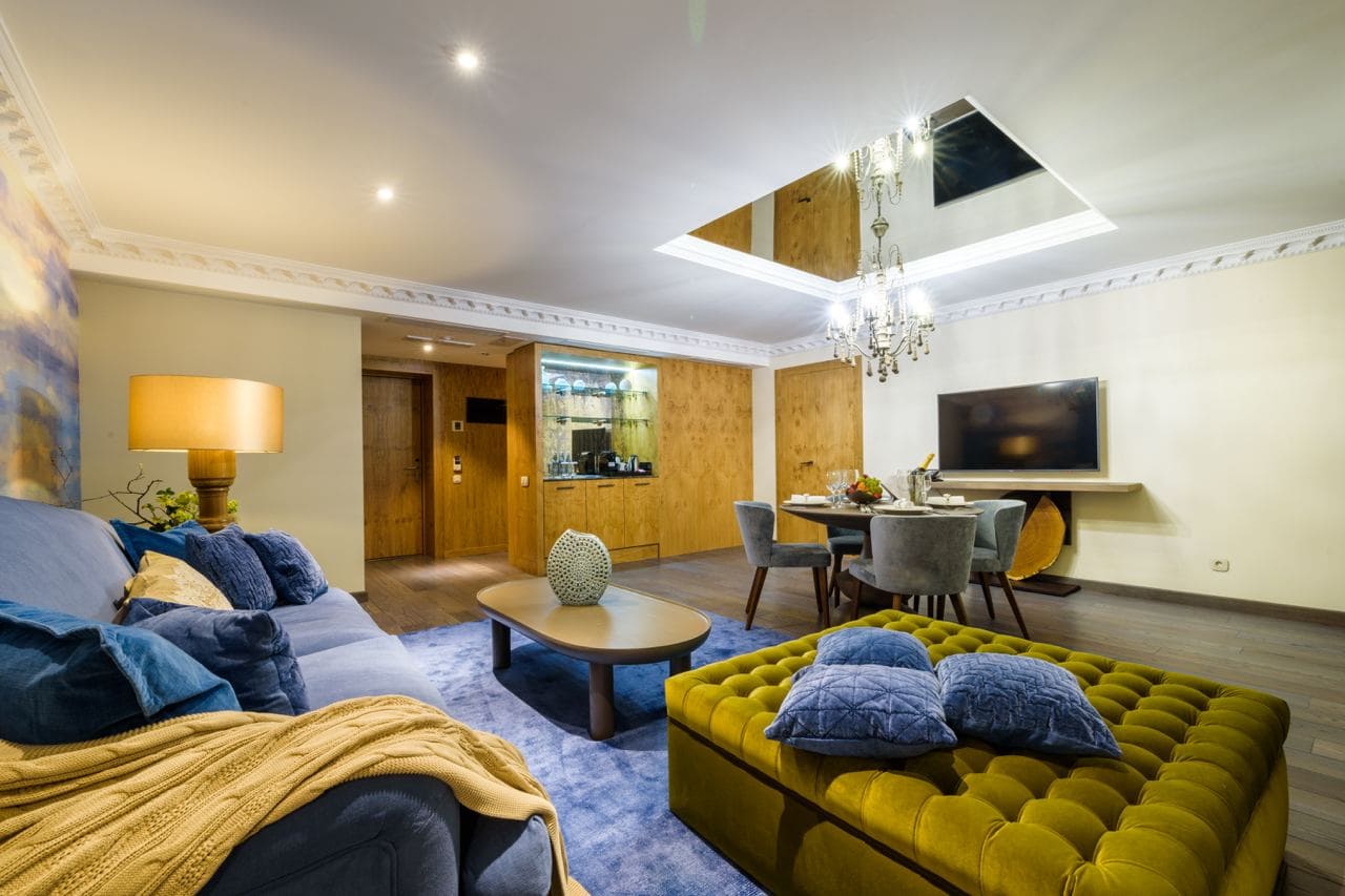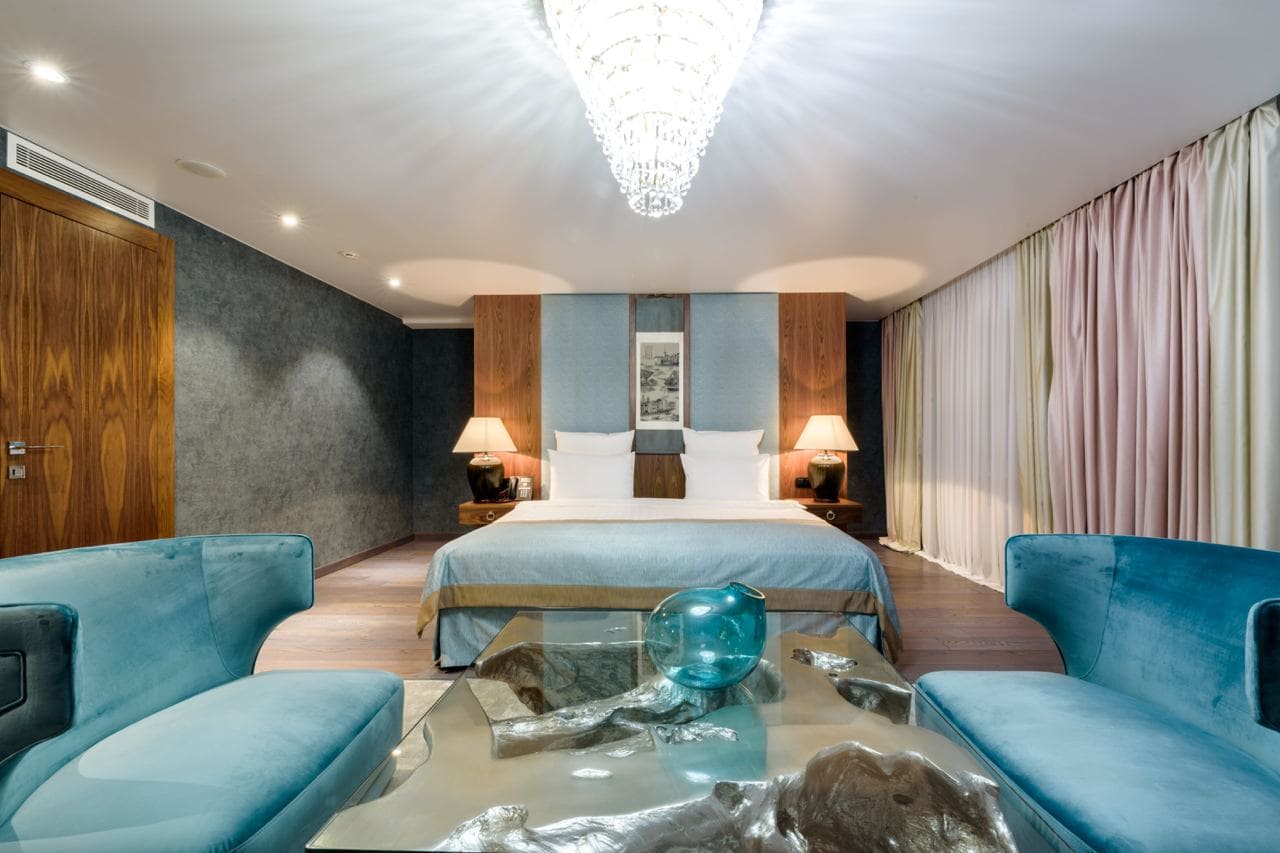 Presidential luxe (Президентский люкс) (150 кв. м): гостиная с обеденной зоной, спальня, ванная комната с ванной.
