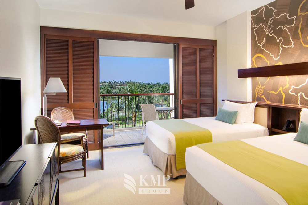 Ocean View Room - Two Queen Beds (48 кв. м). Элегантные комфортабельные номера. Небольшая зона отдыха с мягким креслом, рабочий стол. Вид из номера на тропический сад, прудик с рыбками и частичный вид на океан.
