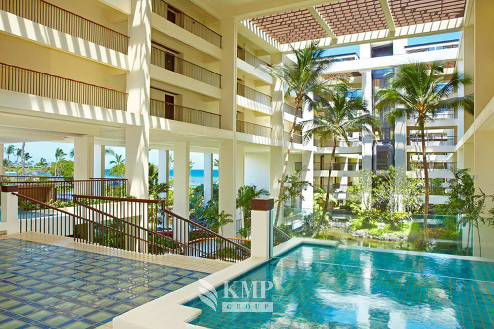 Deluxe Ocean View Room - Two Queen Beds (48 кв. м). Элегантные комфортабельные номера. Небольшая зона отдыха с мягким креслом, рабочий стол. Вид из номера на тропический сад, прудик с рыбками и частичный вид на океан.