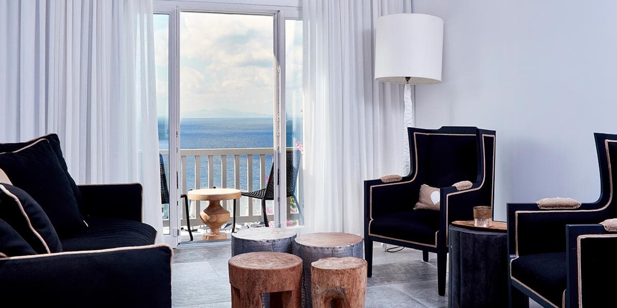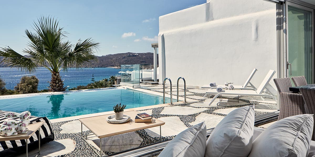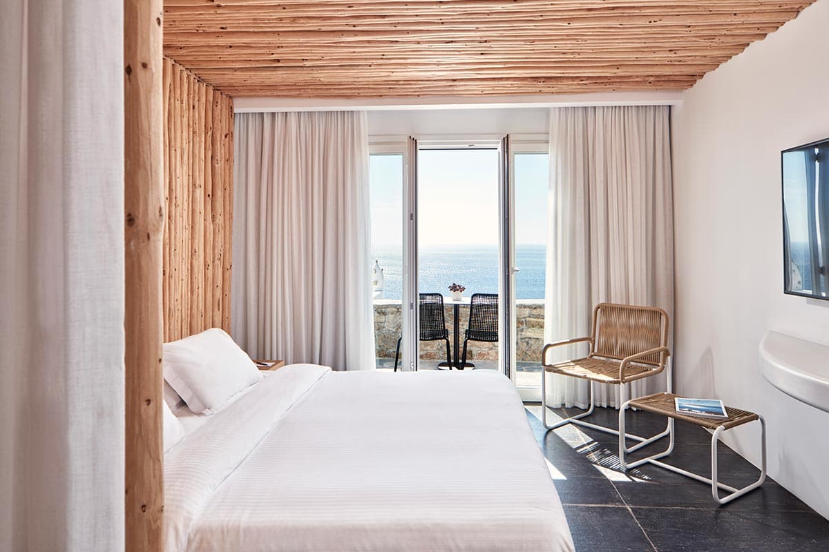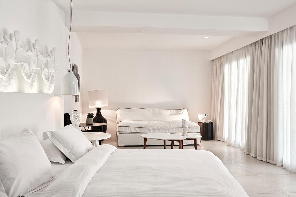 На южном побережье острова, в местечке Элия, в 20 минутах езды (12 км) от аэропорта Миконоса.