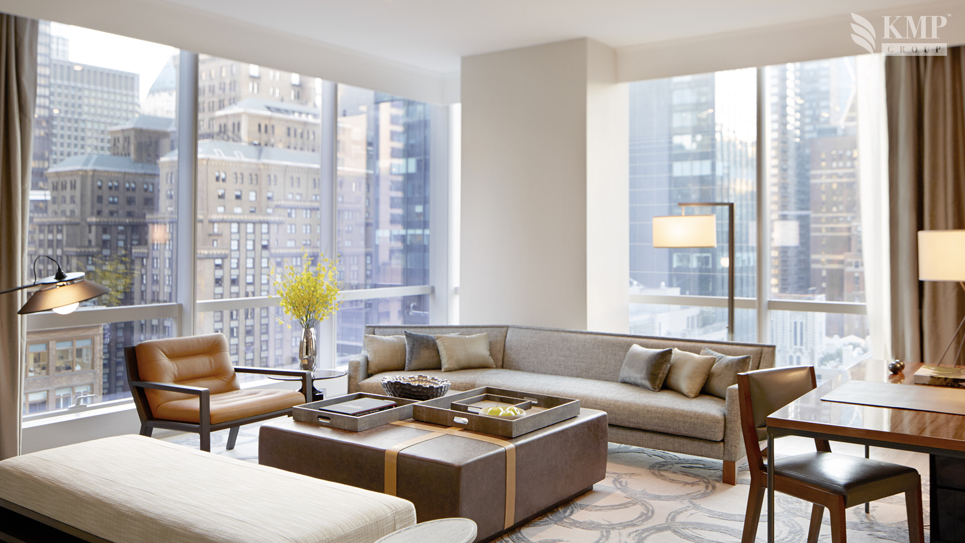 1 bedroom city view suite (94-97 кв. м): гостиная, спальня с кроватью king-size, ванная комната с ванной и душевой кабиной с функцией «тропический дождь», гостевой туалет. Расположены в угловой части здания. Панорамный вид на 57 улицу. Услуги персонального камердинера.