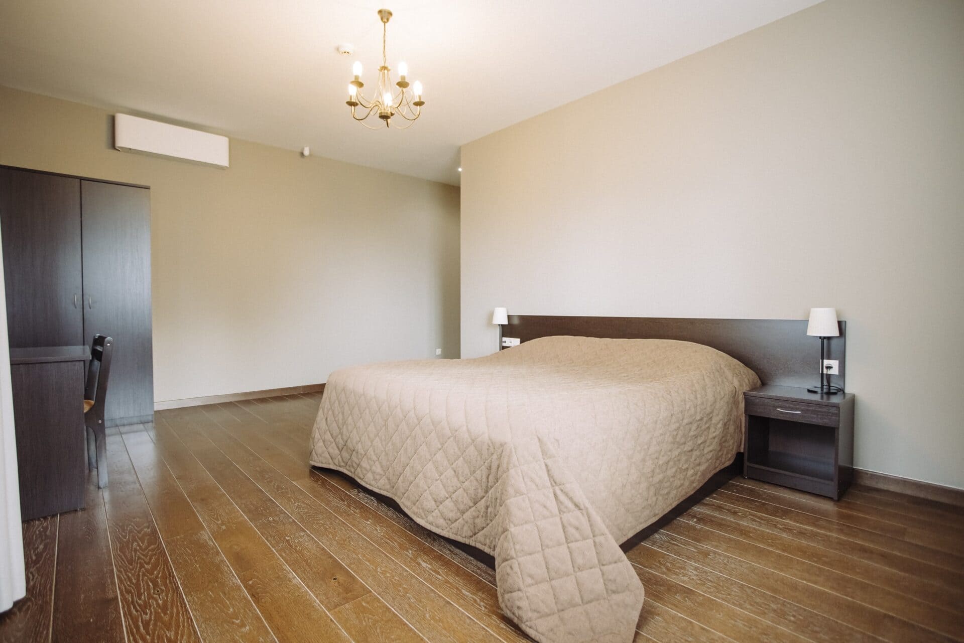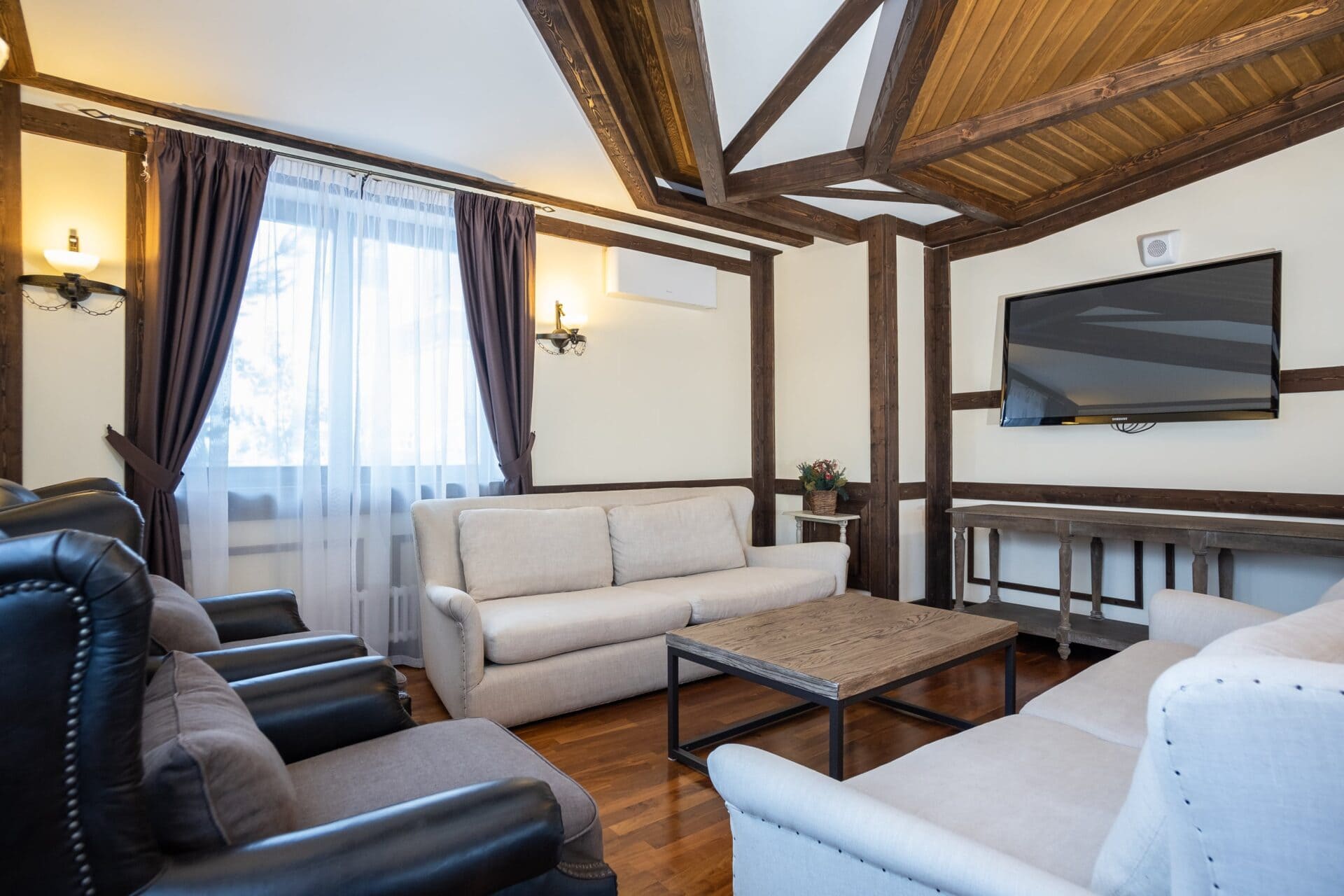 В каждом шале: телевизор, Wi-Fi доступ в Интернет, камин, холодильник, электроплита, посудомоечная машина.