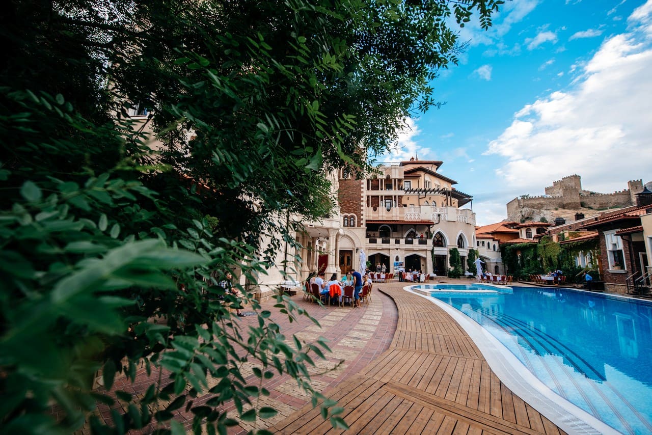 Полулюкс Комфорт В отеле Soldaya Grand Hotel & Resort имеется 15 однокомнатных номеров категории «Полулюкс Комфорт». Это просторные комфортабельные номера с общей площадью 32 кв.м. Особенностью номеров данной категории является роскошная обстановка и эксклюзивный дизайн каждого из них. Из окон номеров открывается вид на Генуэзскую крепость, бассейн или территорию отеля.