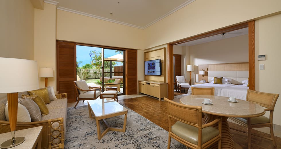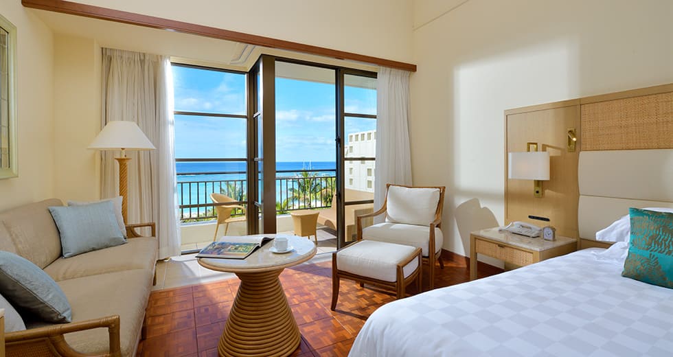 Deluxe natural ocean view room (36 кв. м): терраса, прихожая, спальня с гостиной зоной, ванная комната с ванной и душевой кабиной. Расположены на 2 этаже башни North Tower и с 6 по 10 этаж башни Central Tower. Вид на море.
