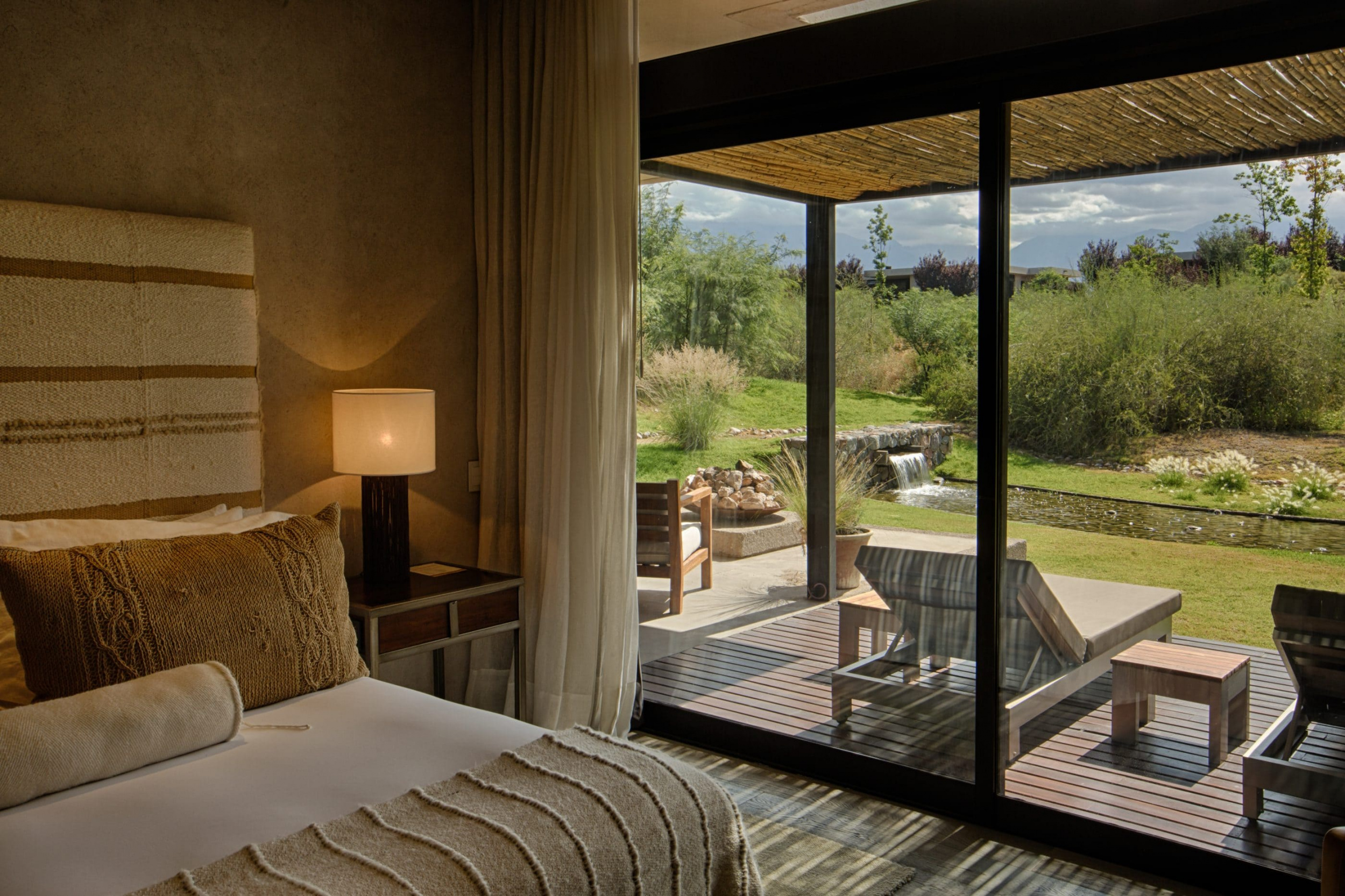 One-bedroom deluxe villa (184 кв. м). Терраса (в некоторых виллах – с открытым персональным бассейном, джакузи, ванной или душем на открытом воздухе), гостиная с камином, спальня, ванная комната. Вид на горы и виноградники.