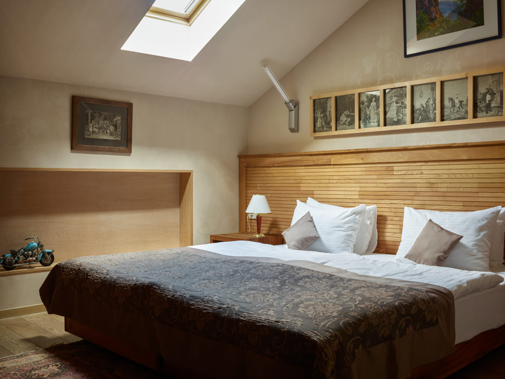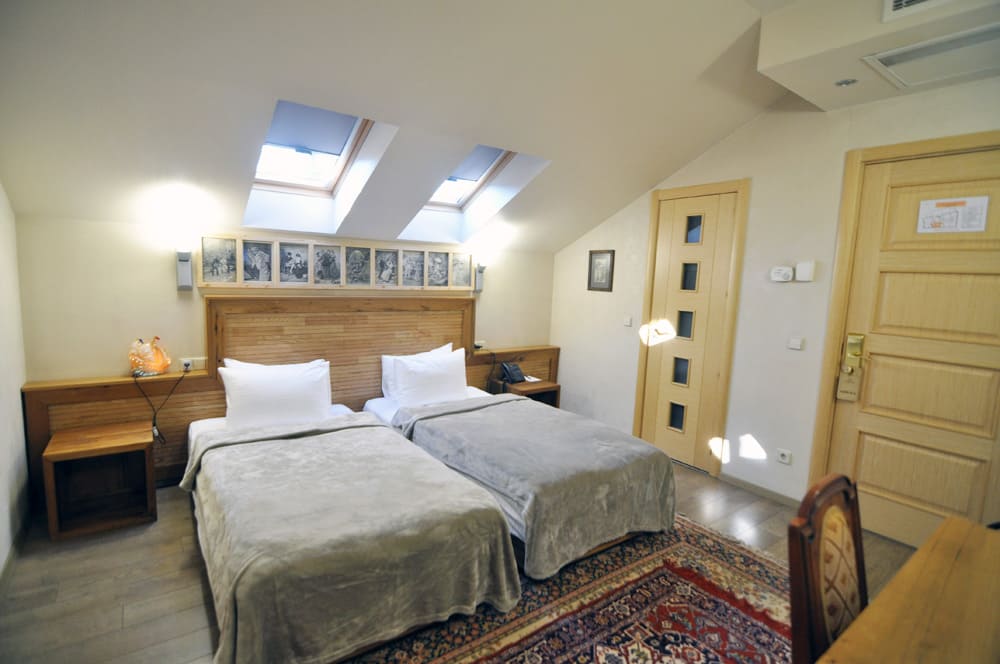 Стандартный номер: Полу-мансардные комнаты со стилизованной современной мебелью из натурально состаренного дуба, большая двухместная кровать или две кровати на Ваш выбор, матрасы из чистого латекса, потолочные окна, рабочий стол, стул, кресло, гардероб/шкаф, вручную украшенные стены, полностью оснащенная ванная комната, ковры из бельгийской шерсти вместе с кавказскими коврами делают эти комнаты особенно уютными.