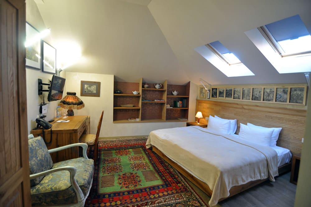 Хамам люкс: Роскошный 100 кв. м. люкс включает в себя хамам (парная сауна), антикварный французский камин, уникальную античную деревянную мебель «Птичий глаз» и мебель из орехового дерева, звуконепроницаемые окна, затемняющие шторы, полы из твердой древесины, рабочий стол, два стола, диваны, два кресла, гардеробы/шкафы и два широких балкона с красивым видом на реку Куру и сад, кровать шириной в два метра, раскладной в двухместную кровать диван, обе кровати с матрасами из чистого латекса, вручную украшенные стены. Эта комната идеально подходит для семьи или любого, кто ищет роскошь и пространство: просторная ванна, отдельный душ и туалет для гостей рядом с хамамом.