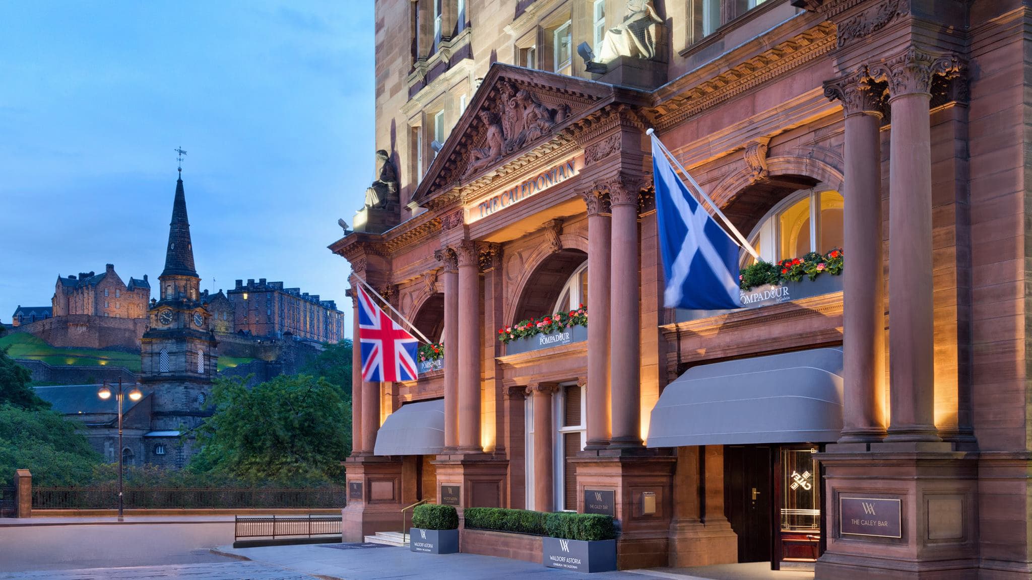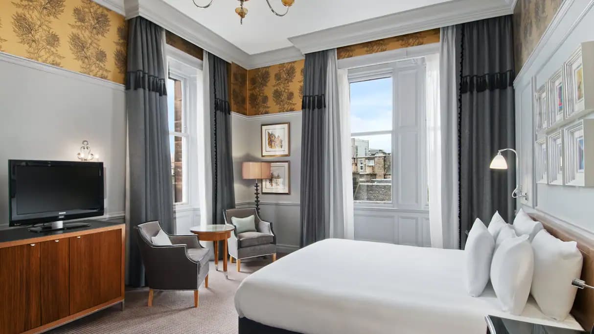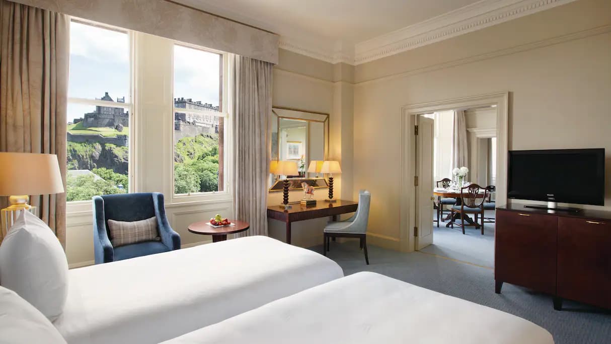 Caledonian Suite With Castle View (120 кв. м). Гостиная с обеденной зоной, две спальни (одна с кроватью queen-size, вторая – с двумя отдельными кроватями), ванная комната. Вид на Эдинбургский замок. Гости данных номеров имеют особые привилегии.