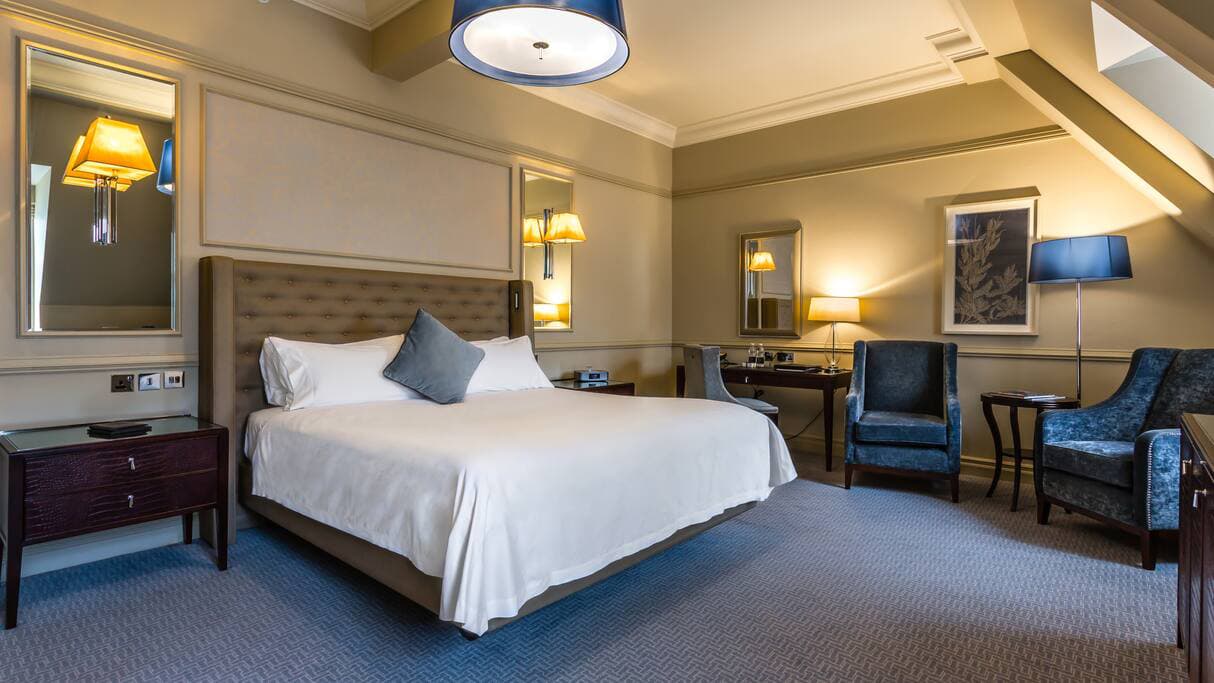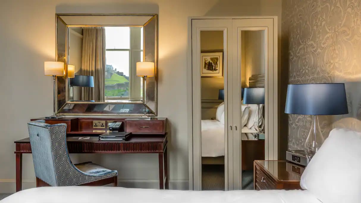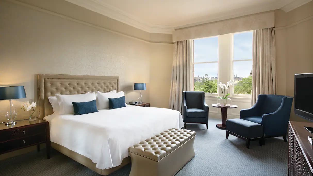 King Premier Room With Castle View (30 кв. м). Гостиная зона, спальня с кроватью king-size, ванная комната. Гости данных номеров имеют особые привилегии. Вид на Эдинбургский замок.