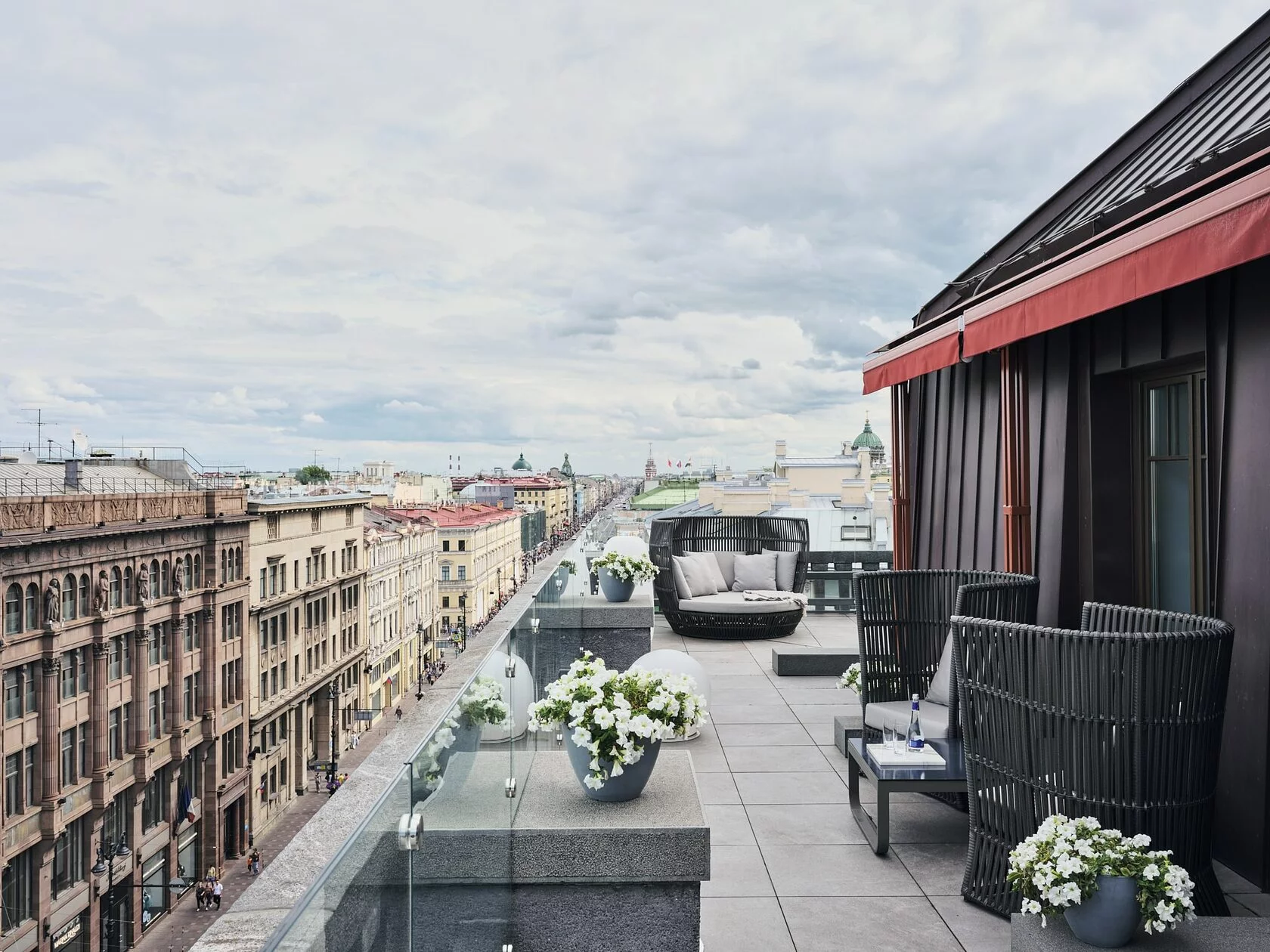 Terrace suite (60 кв. м.): терраса, гостиная или гостиная зона, спальня с кроватью king-size, ванная комната с ванной и душевой кабиной с гидромассажем и хромотерапией, гостевой туалет (в некоторых номерах). Расположены на 6 этаже отеля. Вид на Невский проспект или Малую Морскую улицу.