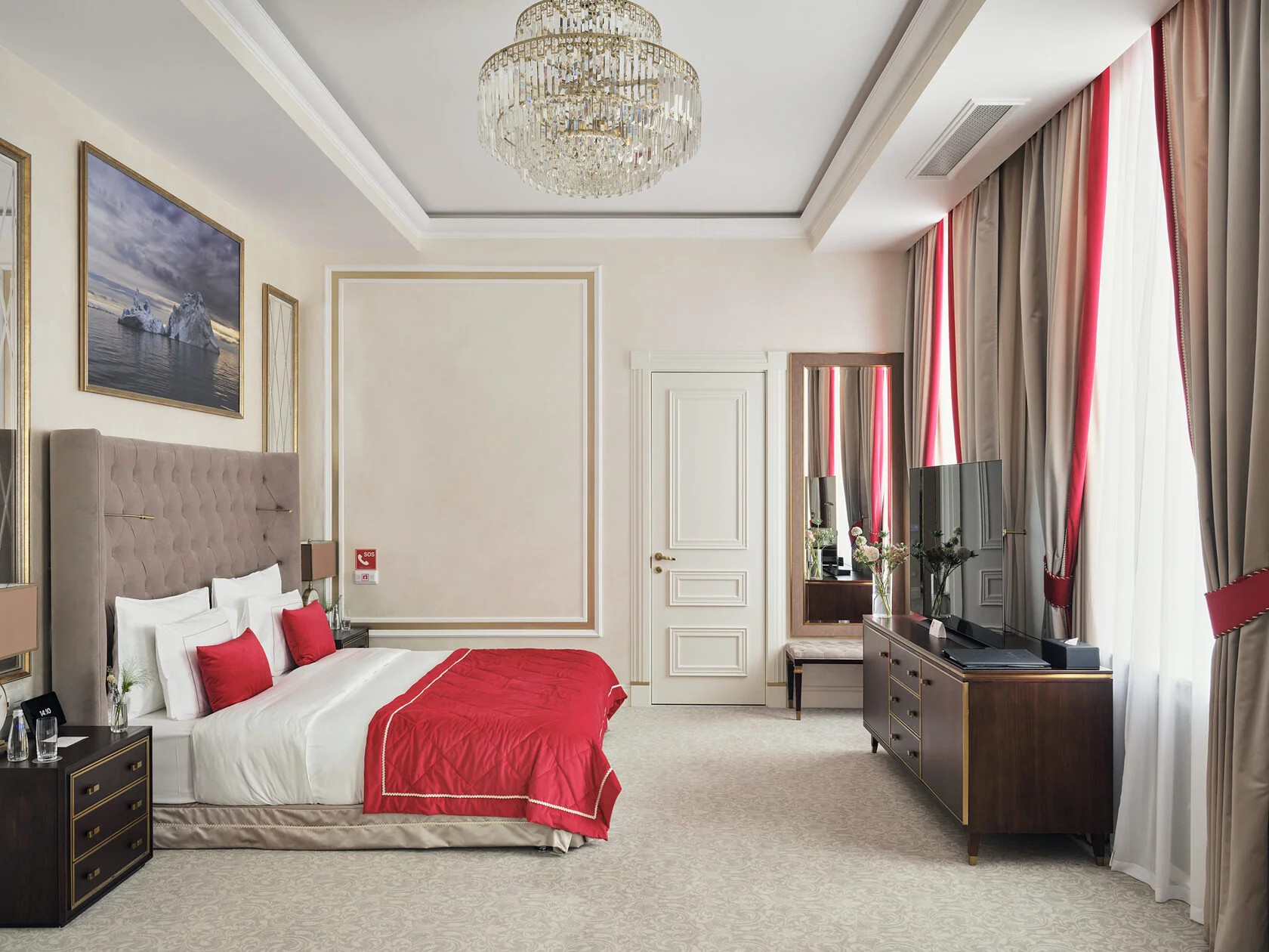 Suite (55 кв. м.): гостиная, спальня с кроватью king-size, ванная комната с ванной и душевой кабиной с гидромассажем и хромотерапией. Вид на Невский проспект или Малую Морскую улицу.