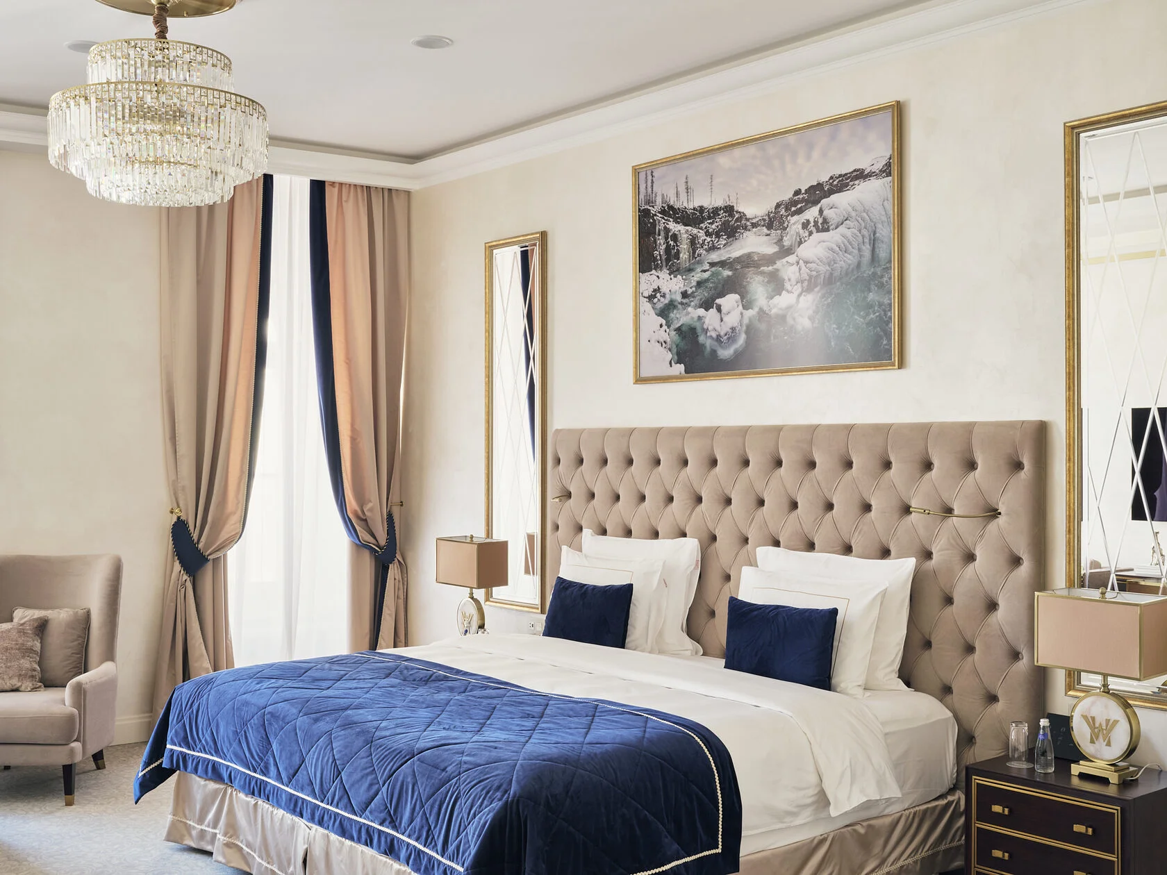 Wawelberg historical suite (177 кв. м.): балконы, 2 гостиные (одна - с обеденной зоной), 2 спальни (каждая - с кроватью king-size), ванная комната с ванной и душевой кабиной с гидромассажем и хромотерапией, гостевой туалет. Дополнительно: камин. Вид на Невский проспект и Малую Морскую улицу.