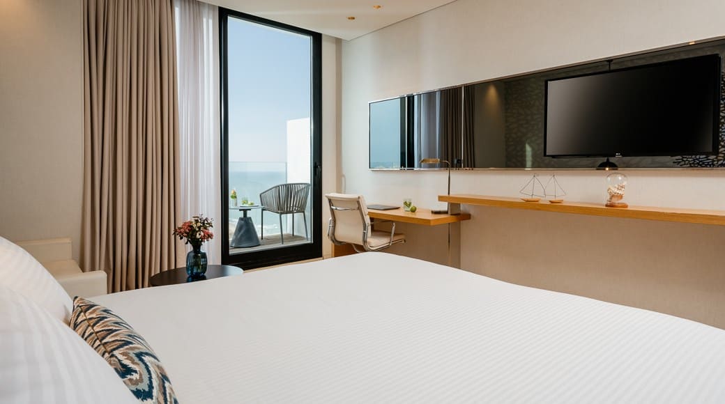 Deluxe Premium Room (32 кв. м). Балкон, гостиная зона, спальня с двуспальной кроватью, ванная комната. Вид на море.