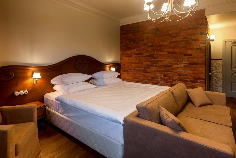2-местный джуниор-сьют (гост. дом) (макс. 2+1 чел., Wi-Fi, телевизор, душ, умывальник, фен, мини-бар, телефон, мягкая мебель, туалет). Доп. место - диван-кровать, может быть установлен без ограничения по возрасту.