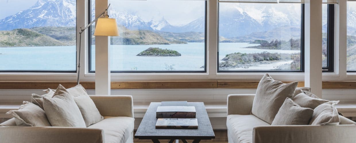 Exploradores suite (42 кв. м): спальня с гостиной зоной (кровать king-size или две отдельные кровати), ванная комната. Вид на гору Macizo del Paine.
