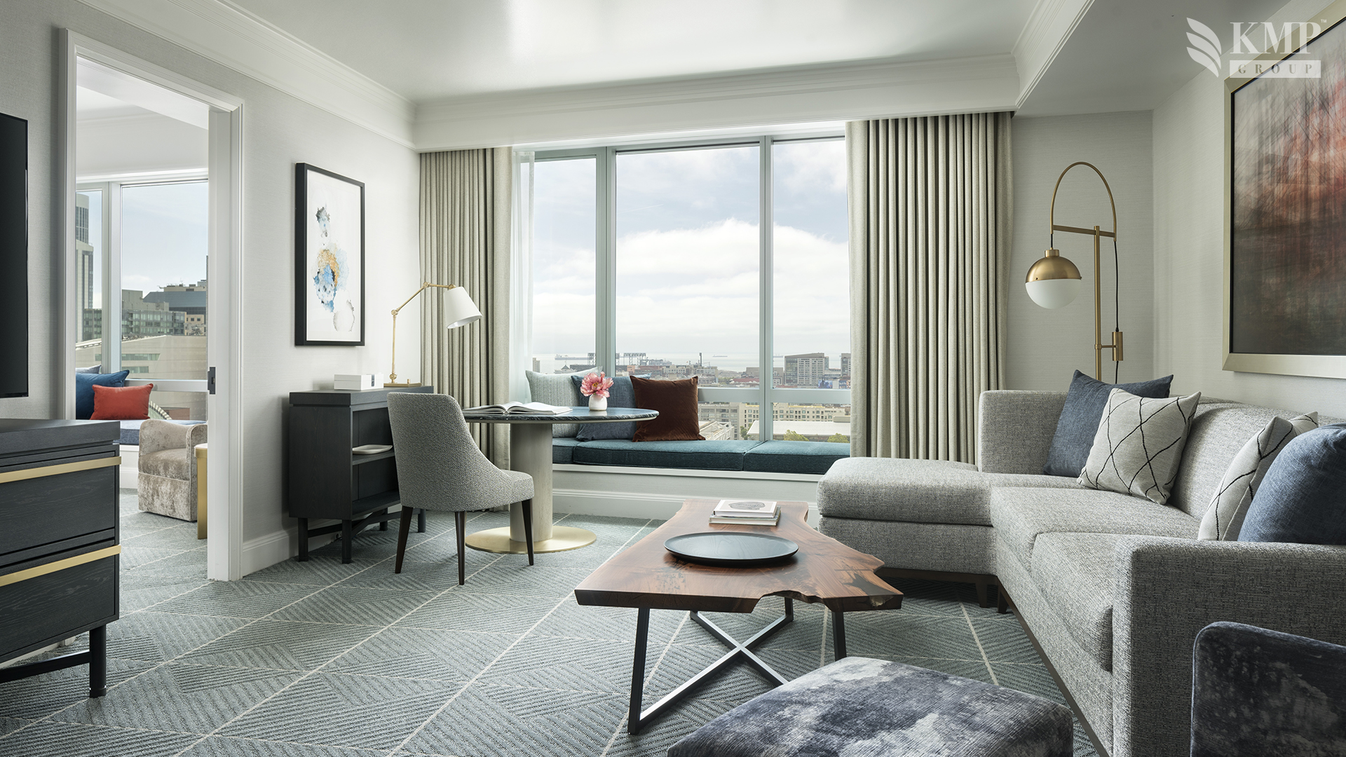 Premier one-bedroom suite (128 кв. м): гостиная с обеденной зоной (стол на 6 персон), кладовая, спальня с кроватью king-size, гардеробная, ванная комната с ванной и душевой кабиной, гостевой туалет. Дополнительно: DVD/CD-плеер, кофемашина Espresso, винный холодильник. Расположены с 12 по 15 этаж. Вид на город, сады Йерба-Буэна и улицу Маркет Стрит. Возможно присоединение дополнительной спальни.