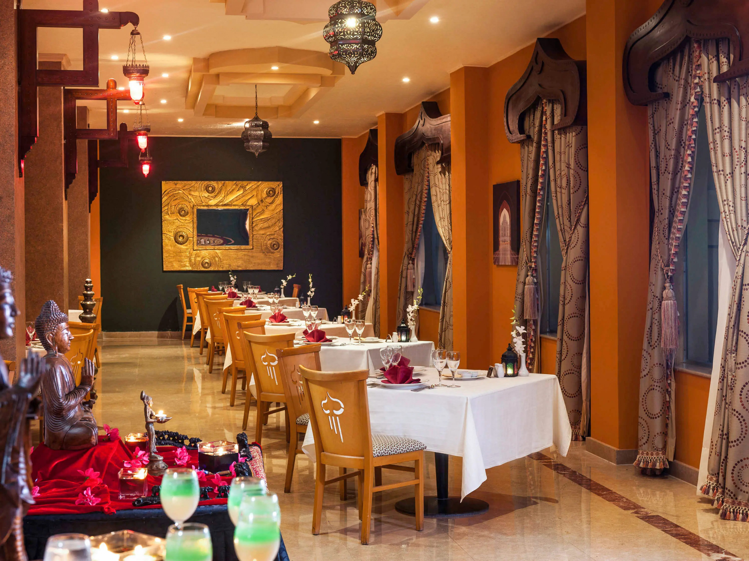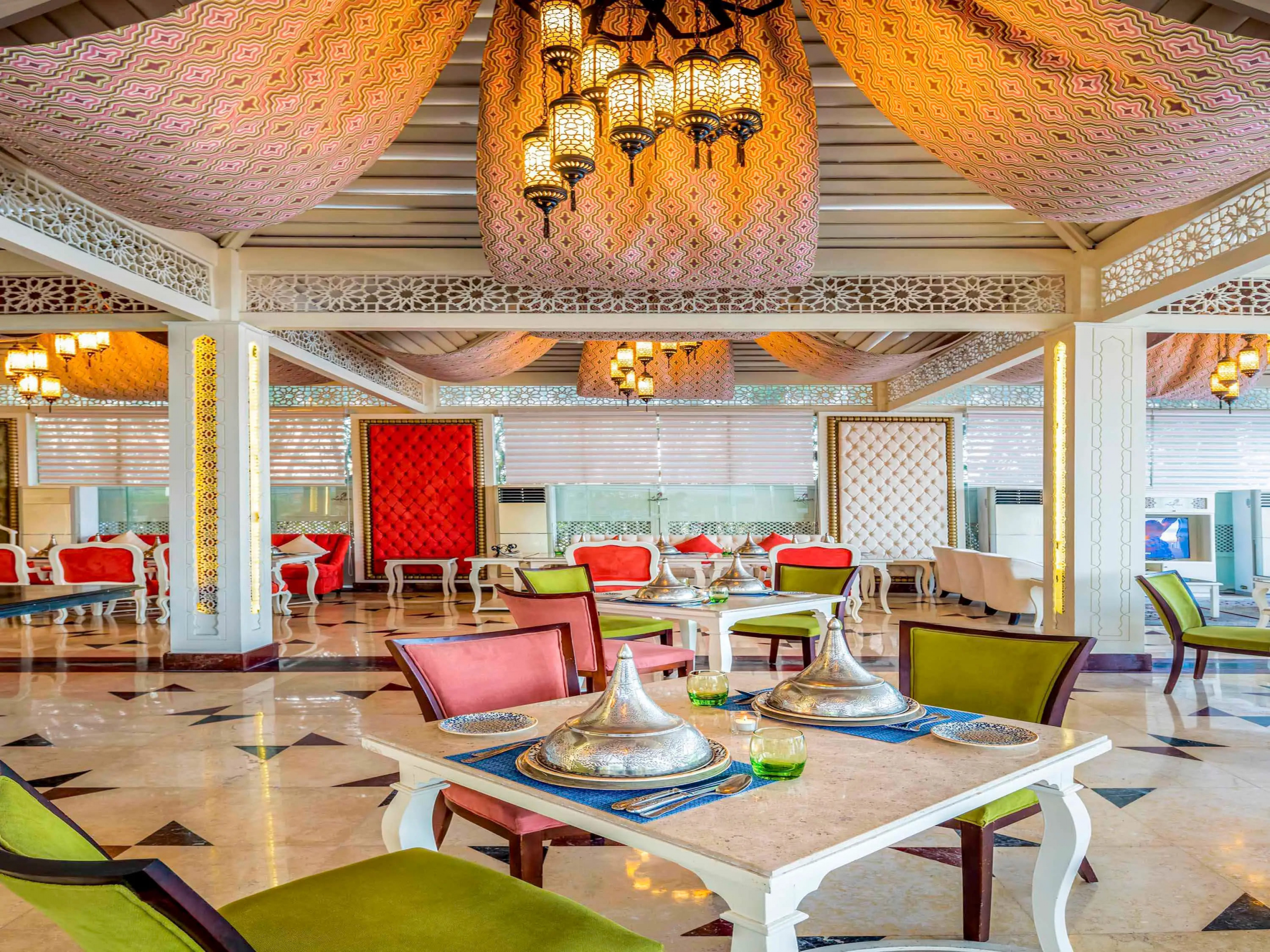 В ресторанах Lalezar, Sakura и Hatmehit подают традиционные блюда турецкой и японской кухни, а также блюда из морепродуктов. В ресторане Callaina с обслуживанием по меню готовят блюда итальянской кухни, а в ресторане Papyrus — блюда восточной кухни. Кроме того, гости могут посетить ресторан индийской и китайской кухни. В курортном отеле проводятся вечерние развлекательные мероприятия. Для гостей работает ночной клуб, дискотека и пляжный ночной клуб на открытом воздухе.