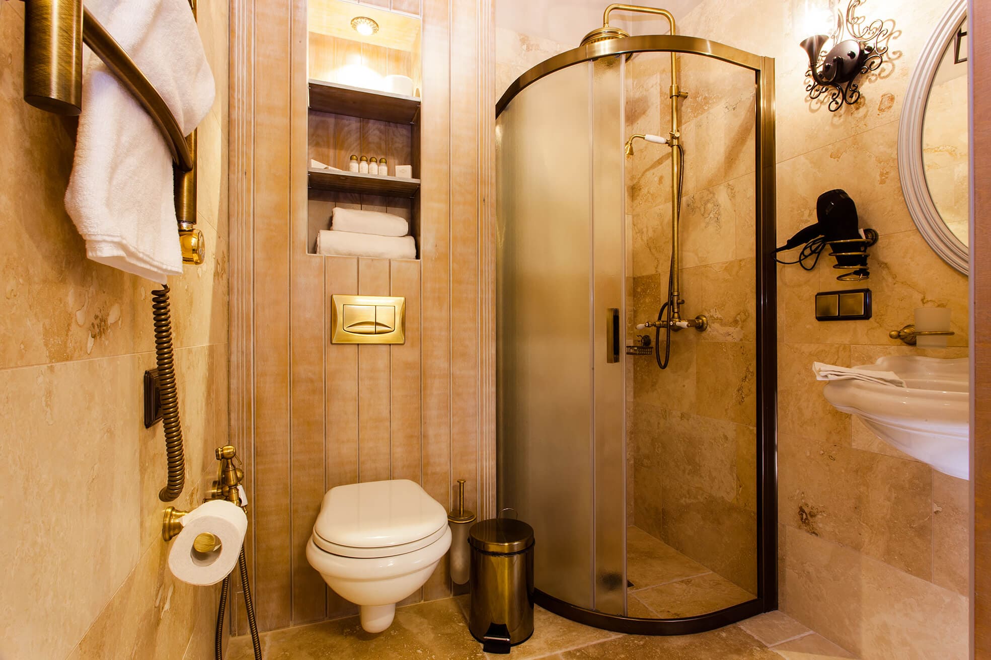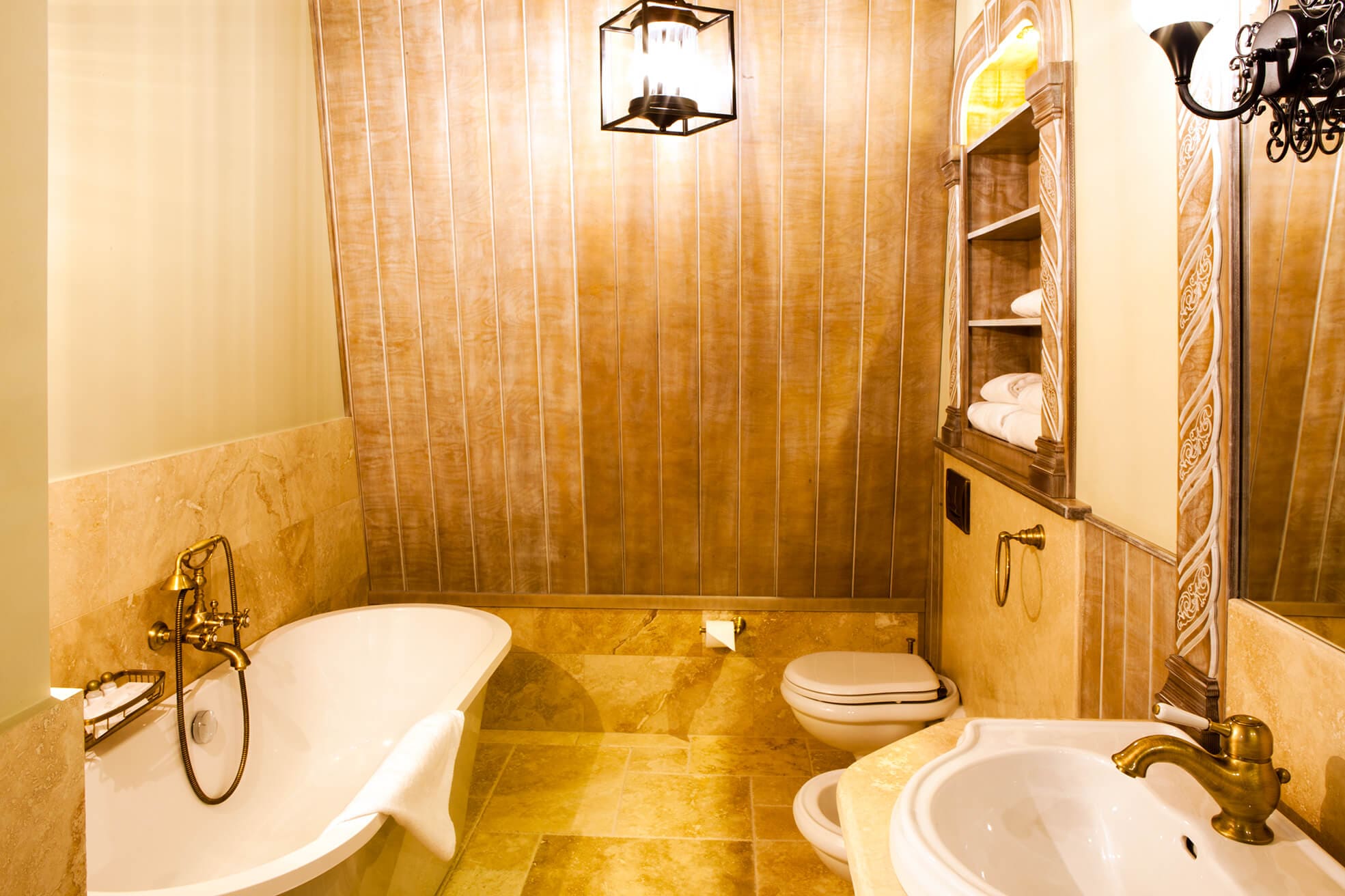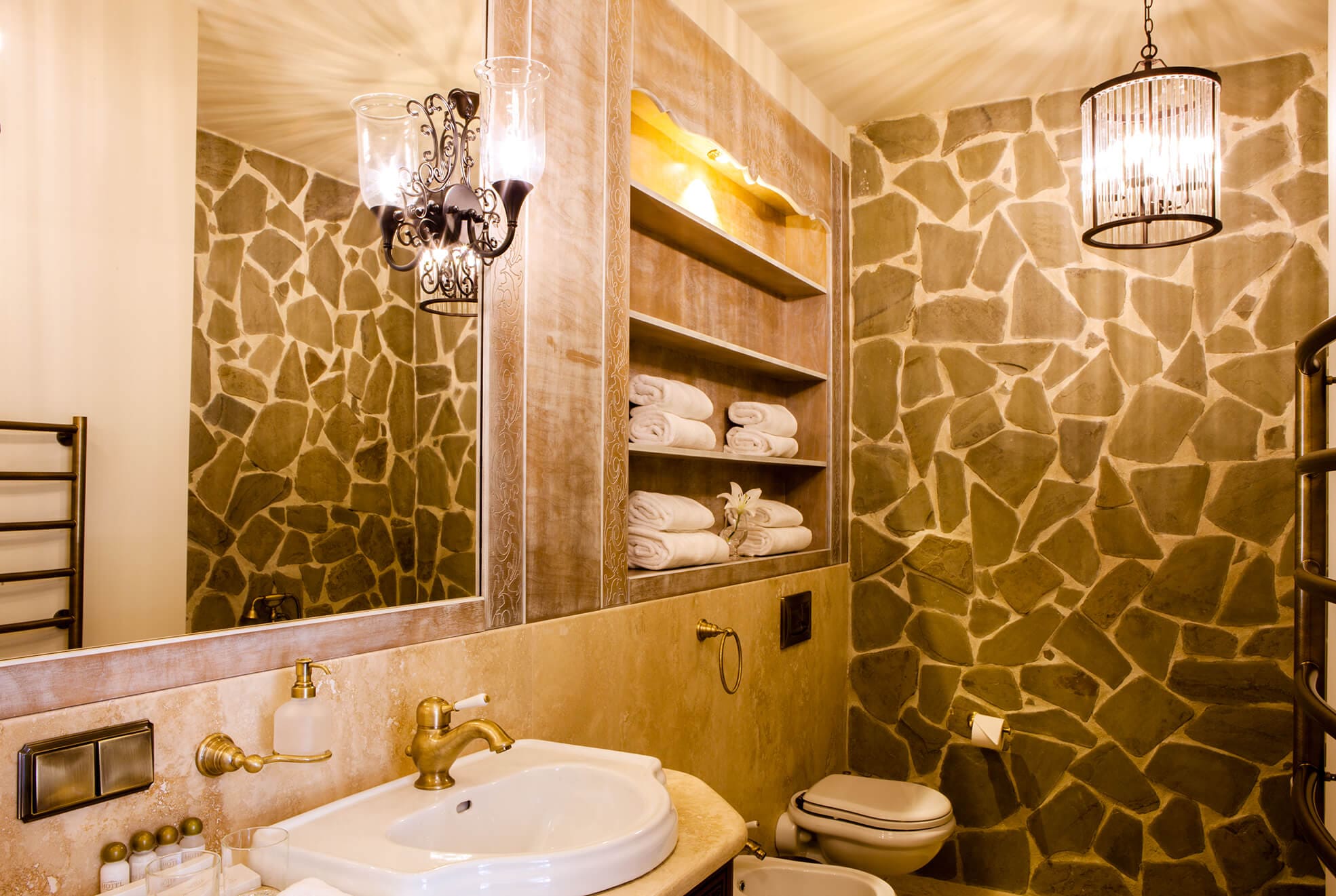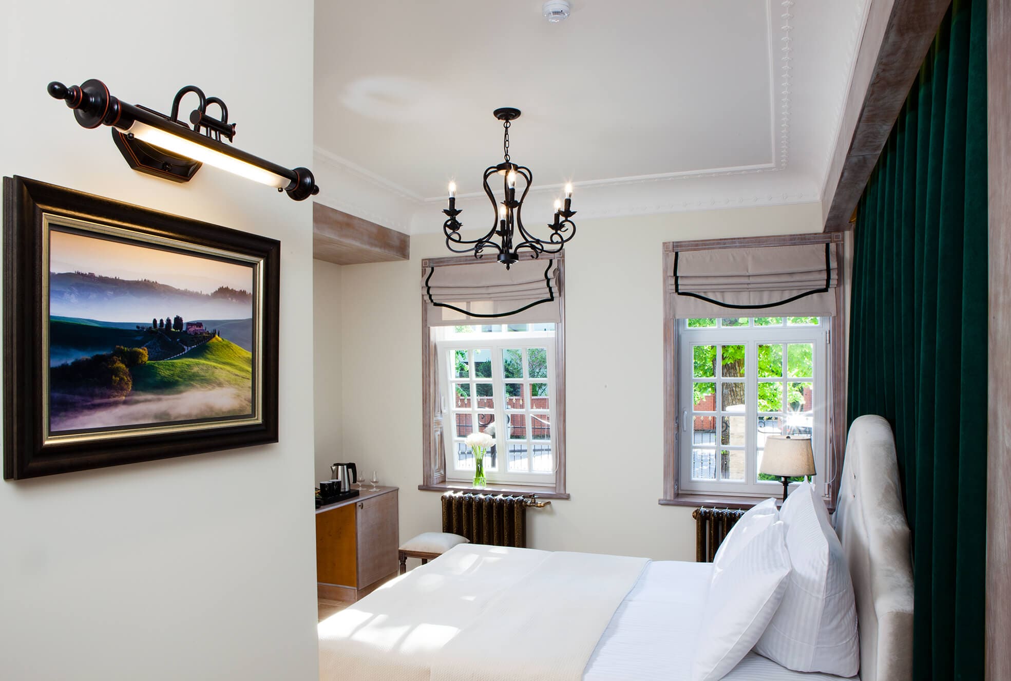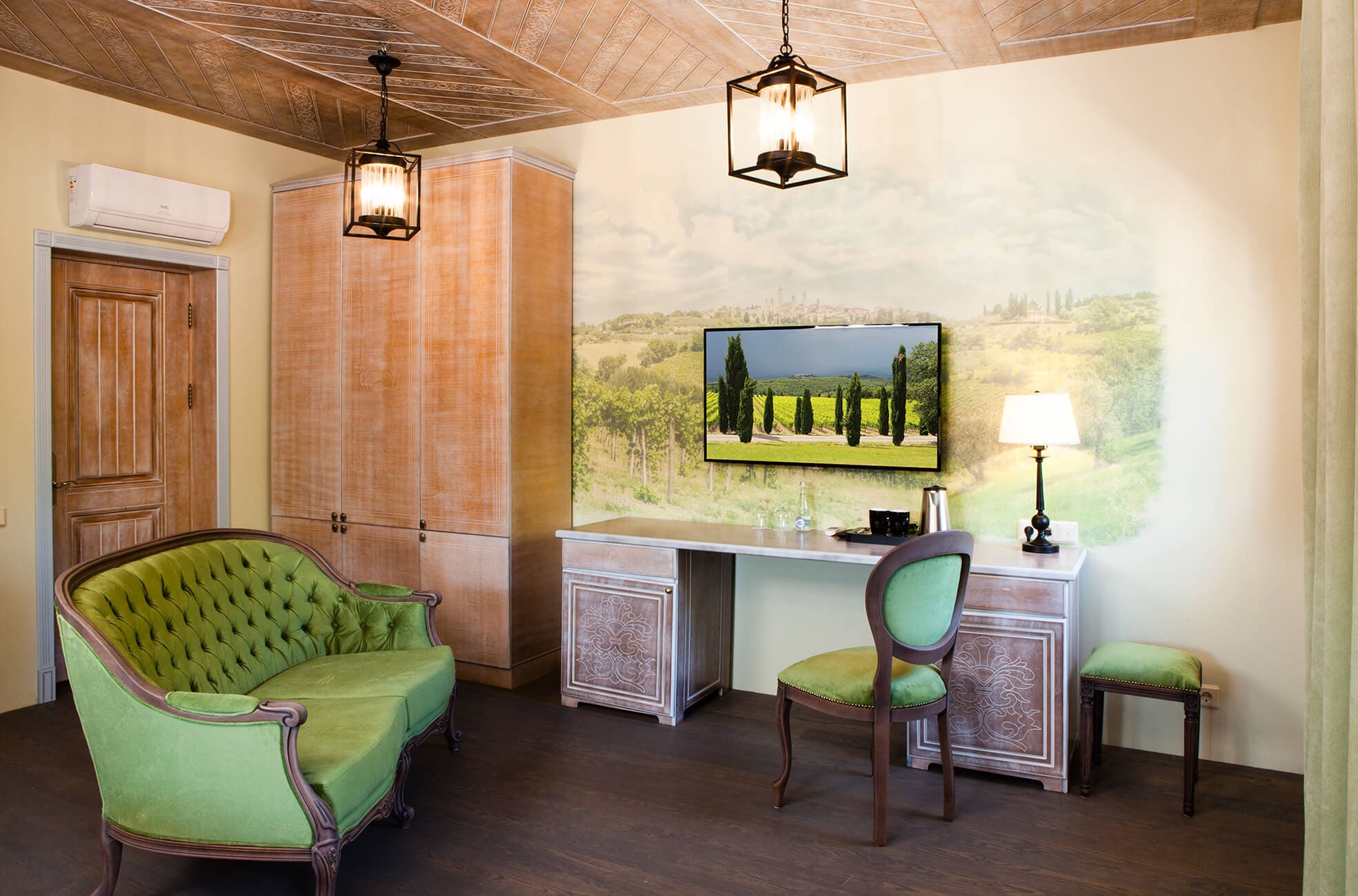 На трёх этажах расположены 15 стандартных номеров с двуспальной кроватью, один одноместный номер, два номера-люкс и две студии, а также детская игровая комната и ресторан. Колористика каждого номера индивидуальна. Пряная терракота, глубокий хвойный цвет или оттенок грозовых облаков создают особое настроение, созвучное главным тосканским мотивам – плодородной земле, яркой зелени и небесам. В отделке интерьера использованы исключительно натуральные материалы. Главные герои – камень и дерево. Стены декорированы травертином. Двери, дверные и оконные порталы, элементы мебели и декора выполнены из состаренного и словно выбеленного до волокон дерева. Брутальная фактура традиционного для Тосканы деревянного потолочного декора контрастирует с нежной, гладкой штукатуркой стен, на которую нанесены роспись «под фреску» и орнаментальные оттиски фотопринтера. Завершает аллюзию средневекового итальянского замка искусная гипсовая лепнина!