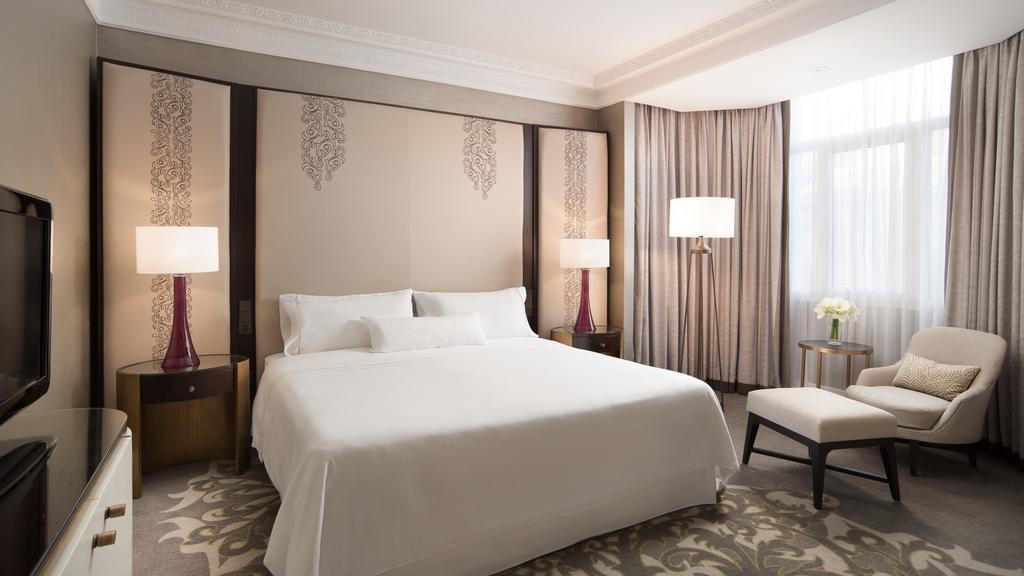 Этот величественный дворец, расположенный в самом сердце Мадрида, был возведен в 1912 году по указанию короля Альфонса XIII. Изысканное здание в стиле ар-нуво венчает эффектный купол, выполненный из витражного стекла. The Westin Palace, Madrid состоит из 468 великолепных номеров. Лучший из них носит название Royal suite. Убранство этого поистине королевского номера по достоинству оценят самые взыскательные гости. Комнаты обставлены изящной мебелью, обитой бархатом, стены украшены картинами и зеркалами в массивных рамах, а полы устланы роскошными коврами. Особого внимания заслуживает оформление библиотеки: мраморный камин, мебель из резного дерева, бронзовые светильники, старинные книги в кожаных переплетах с позолоченными корешками… Просторная ванная комната, облицованная черным мрамором, оборудована сауной и джакузи. Гостей номера Royal suite обслуживает персональный камердинер. The Westin Palace, Madrid располагает прекрасно оснащенным фитнес-центром WestinWorkout с панорамным видом на город.