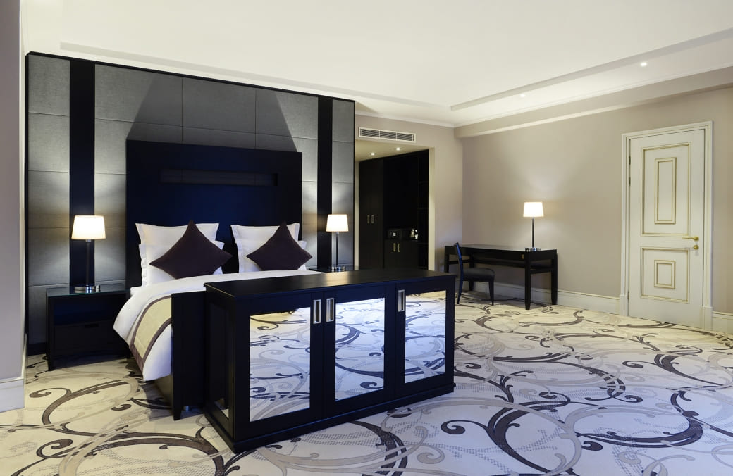 Royal suite (420 кв. м): гостиная с обеденной зоной, спальня с кроватью king-size, ванная комната с ванной и душевой кабиной. Расположен на 5 этаже в новой части отеля. Панорамный вид на город.