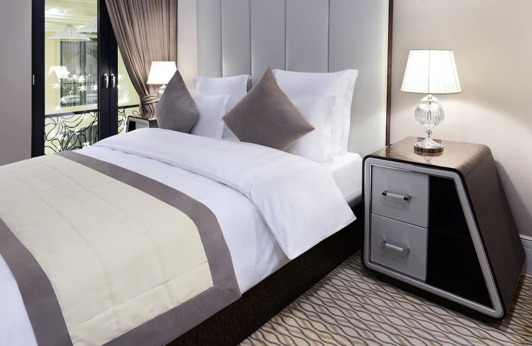 Luxury suite (40-90 кв. м): балкон, спальня с гостиной зоной (кровать king-size), ванная комната с ванной/душем. Расположены с 1 по 4 этаж в исторической части отеля. Вид на реку Куру.